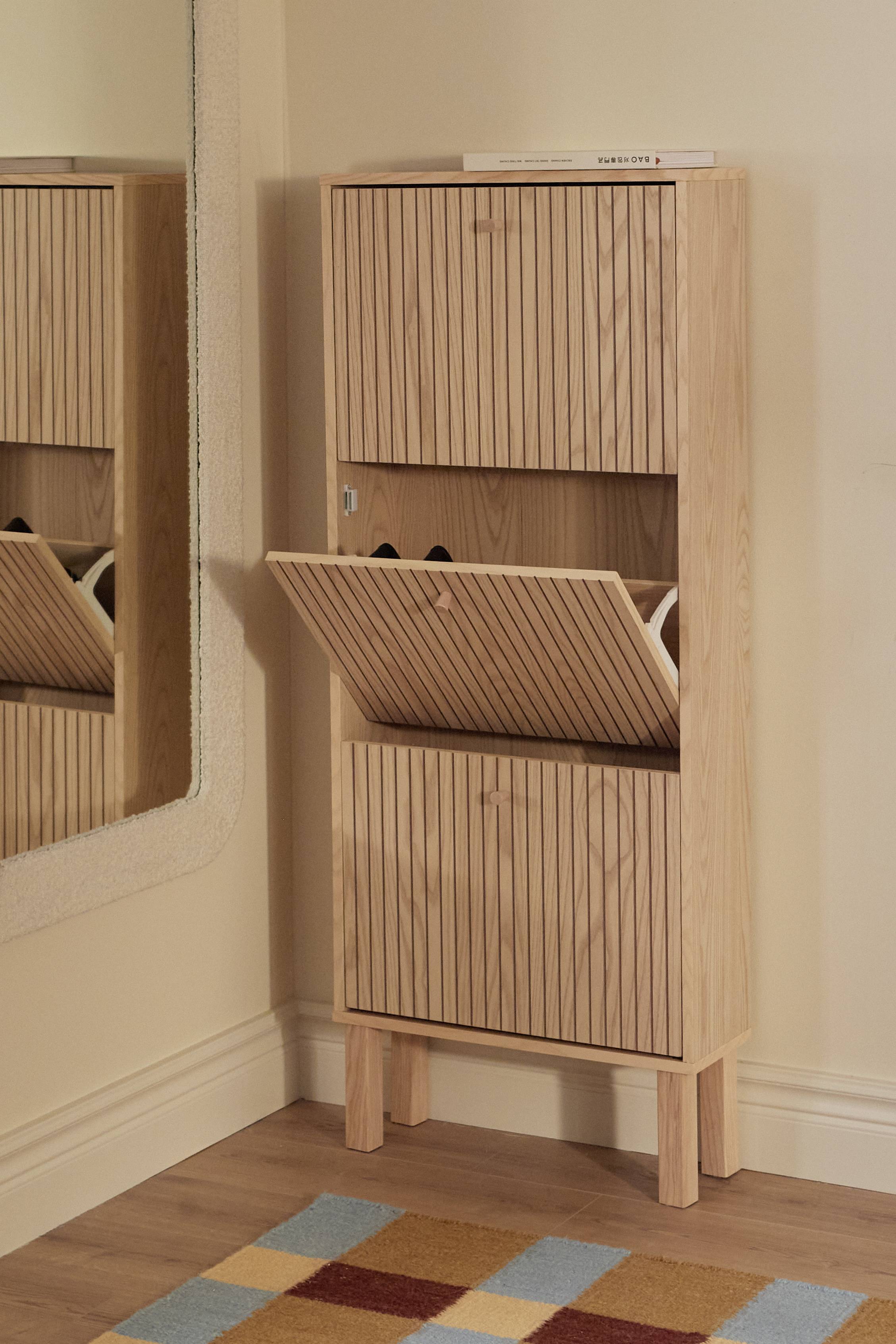 • Skooppbevaring med tre sammenleggbare skuffer • Laget av finert med ask MDF • Bein i fast aske • Mål på esken: Bredde 29 cm, høyde 36 cm, dybde 10 cm • Fri høyde under møbler: 18 cm • Bør forankres til veggen. Skruer og plugger er ikke inkludert.