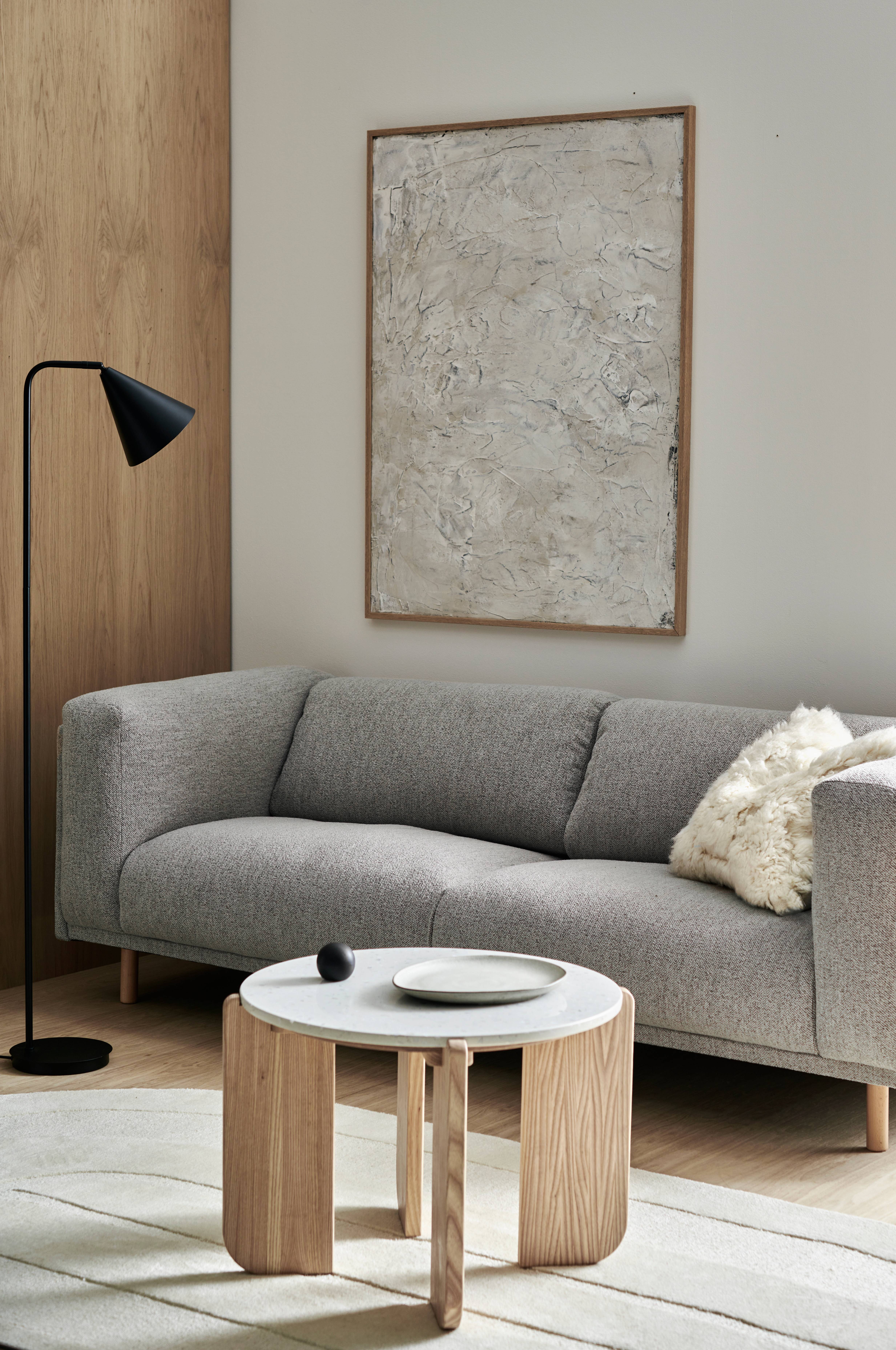 3-seters sofa med trekk i bouclé av polyester. Faste armlener. 2 ryggputer med avtagbart trekk.