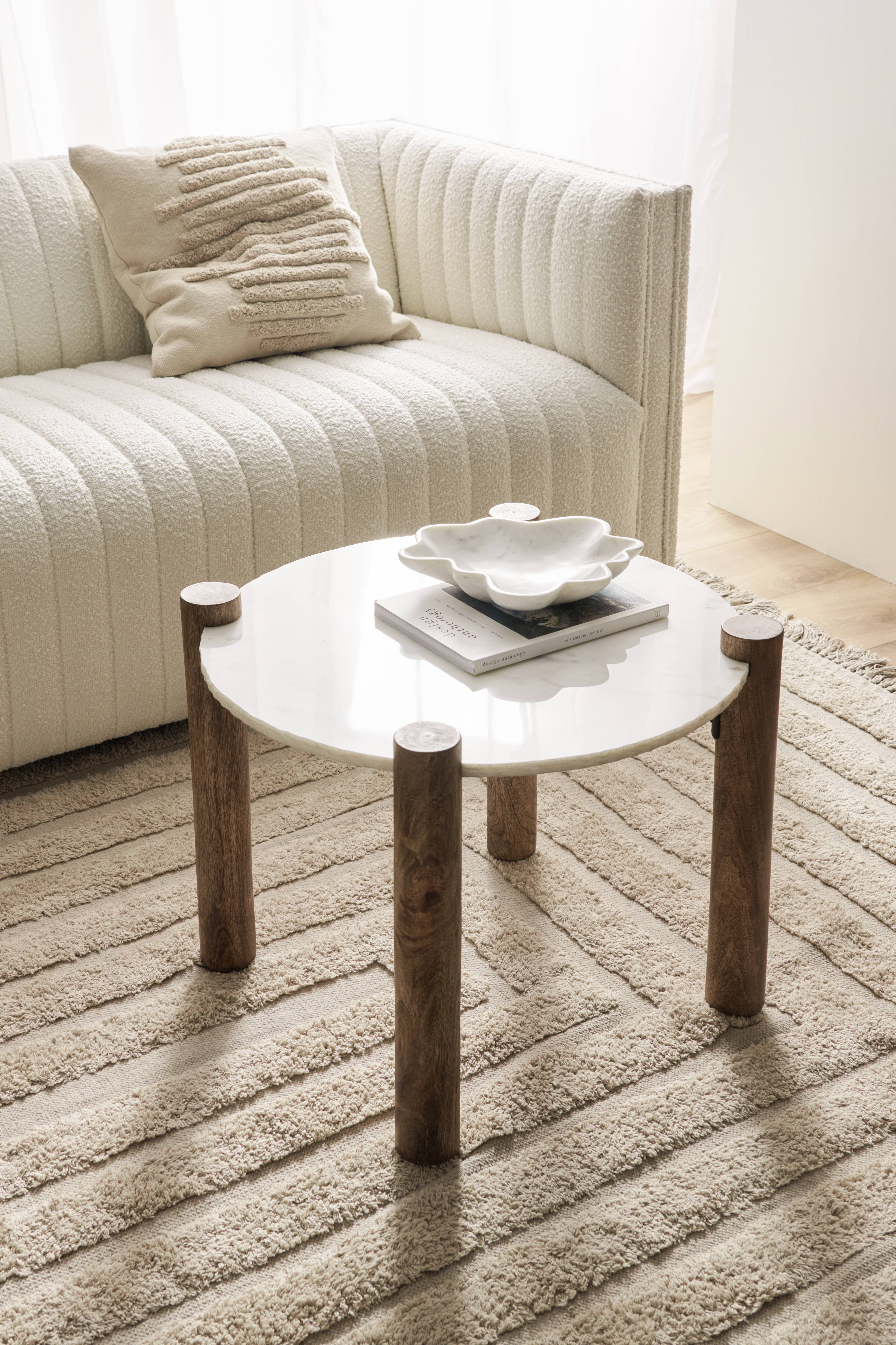 Sofabord med bordplate i polert marmor med rå tekstur på siden. Marmorplatens tykkelse 15 mm. Ben i massivt mangotre med vokset overflate. Maks vekt 20 kg.