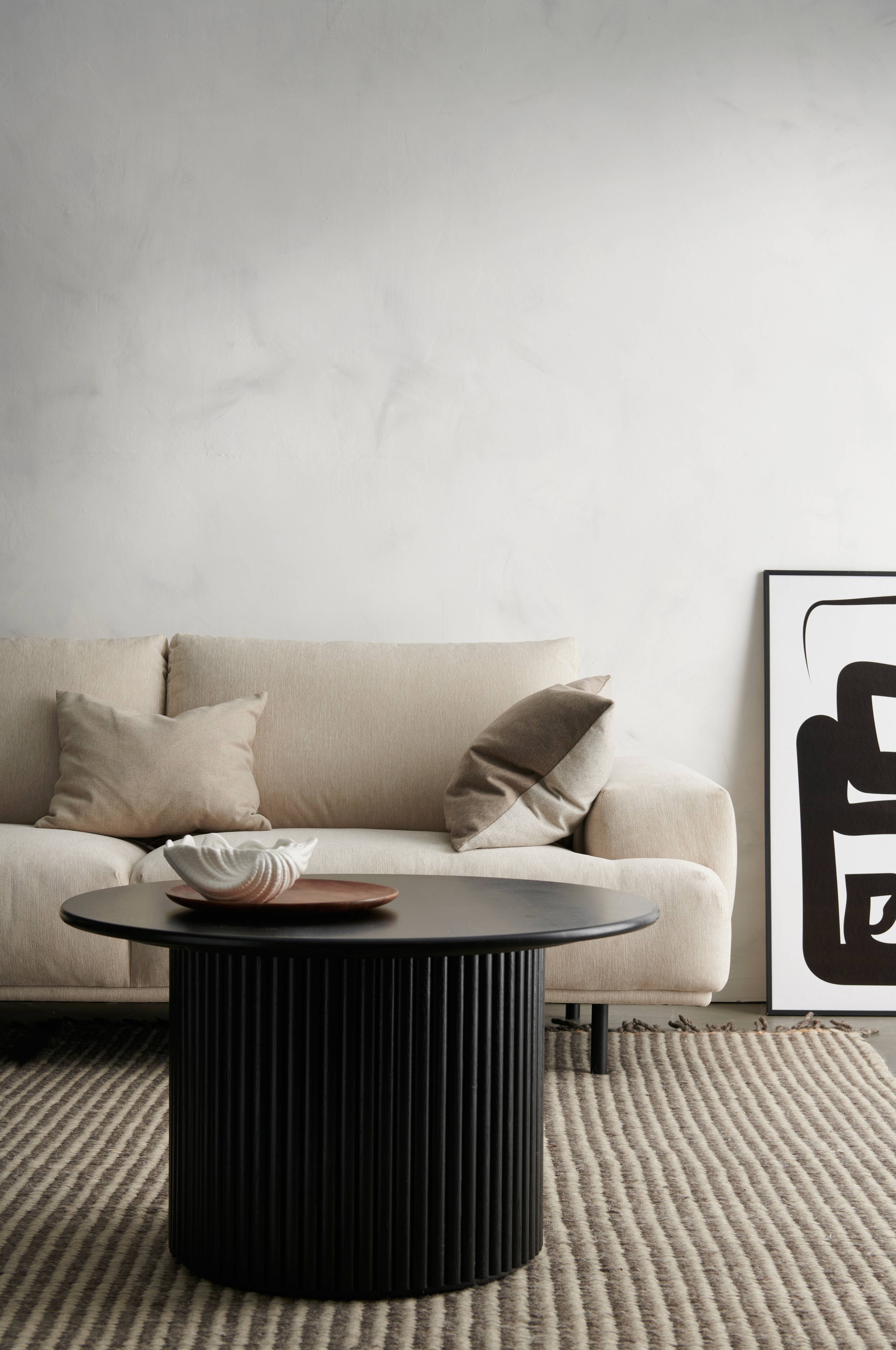 Rundt sofabord i massiv eik. Rund, stabil base i massivt tre og MDF med monterte staver rundt som gir basen en ribbet struktur. Behandlet med vannbasert lakk. Høyde 48 cm, diameter på bordplaten er ca. 80 cm. Leveres umontert.