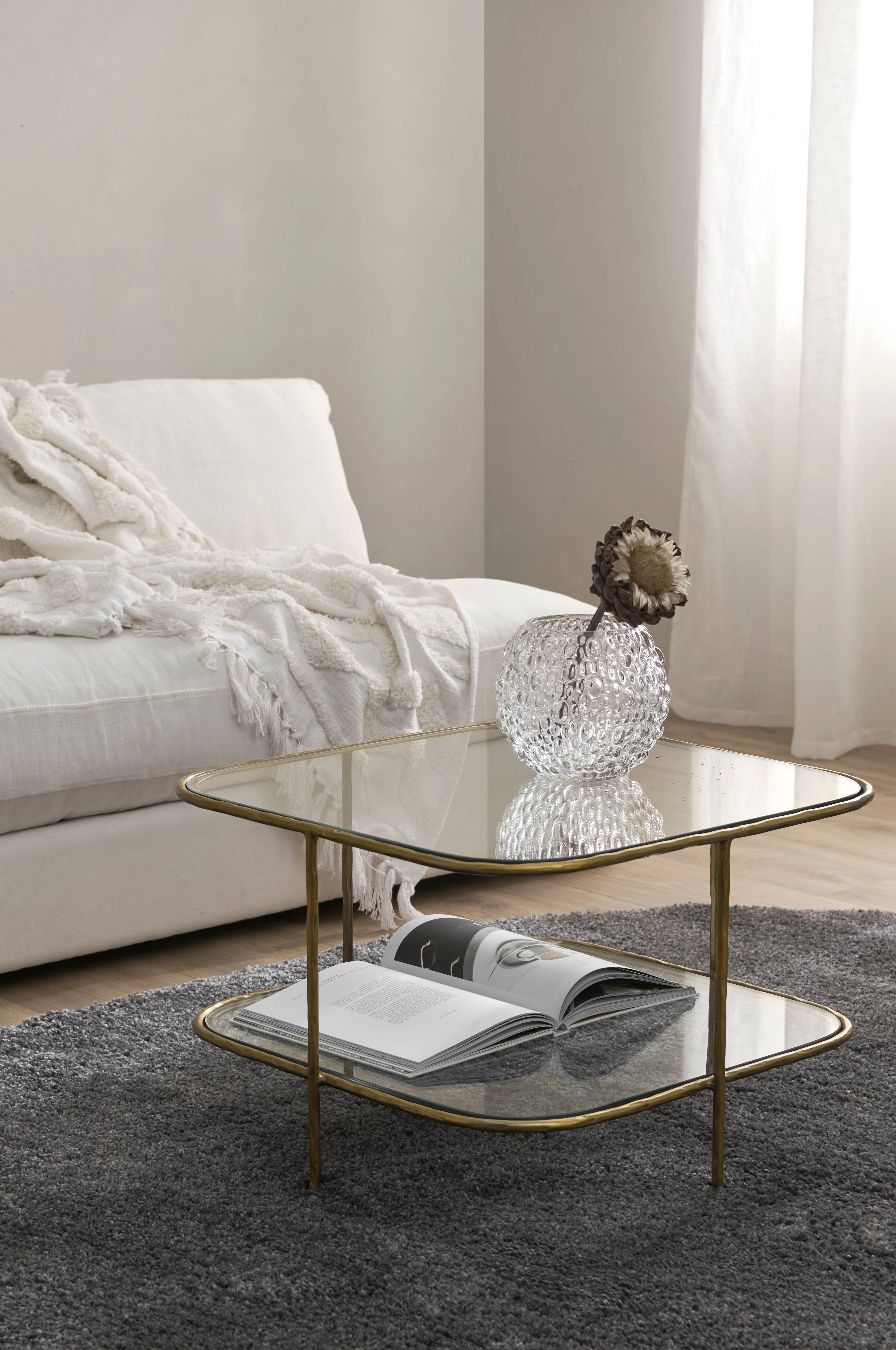 Kvadratisk sofabord av metall i to etasjer med bordplater av herdet glass. Kanter i metall med hamret tekstur. Høyde mellom platene ca. 25 cm. Enklere montering.