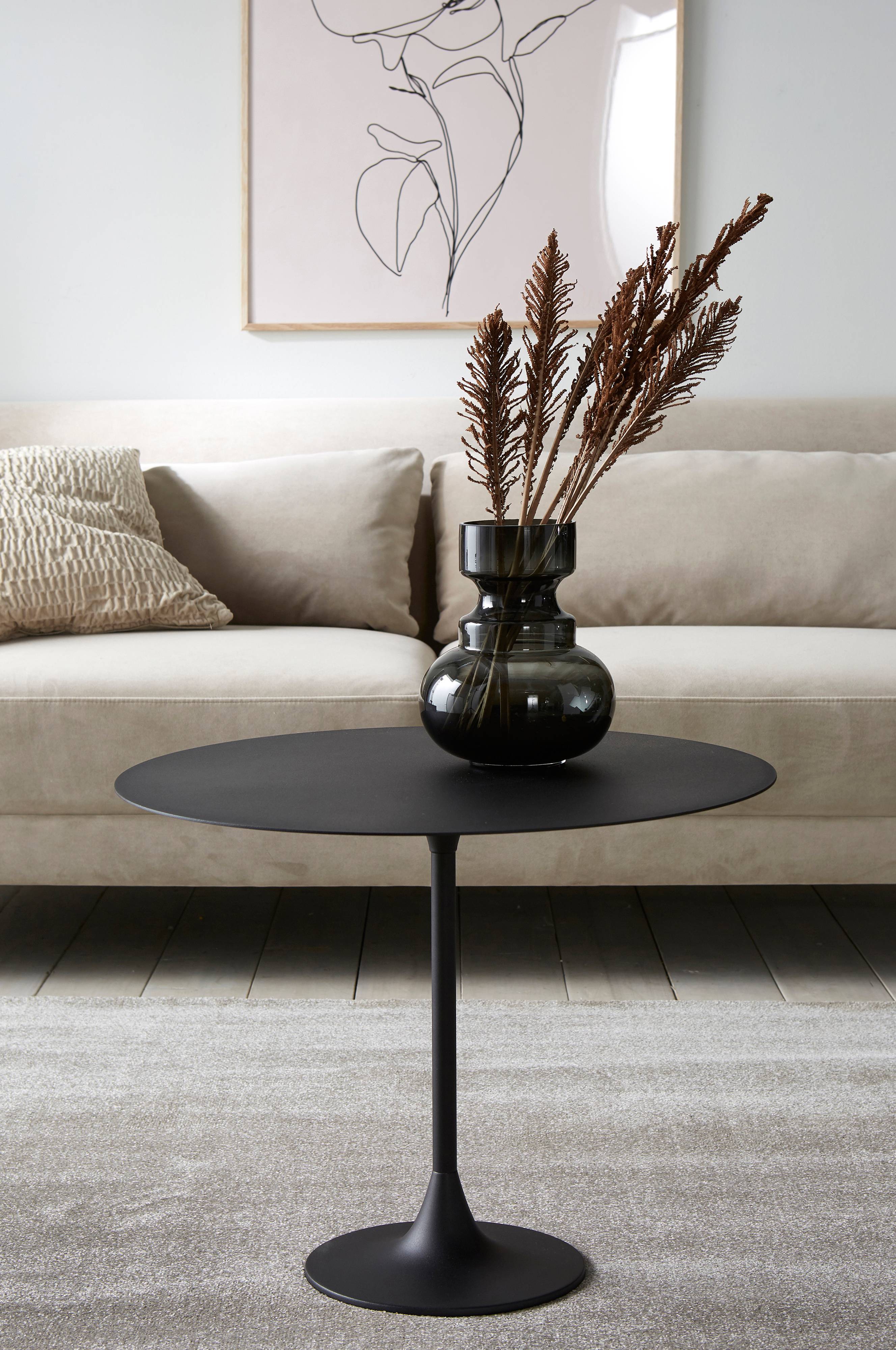 Nett sofabord av metall i sandfinish med lett struktur. Tynn bordplate, tykkelse 2 cm, og en tyngde i bunnen som gjør at bordet står stødig. Høyde 46,5 cm, Ø 60 cm. Montert.