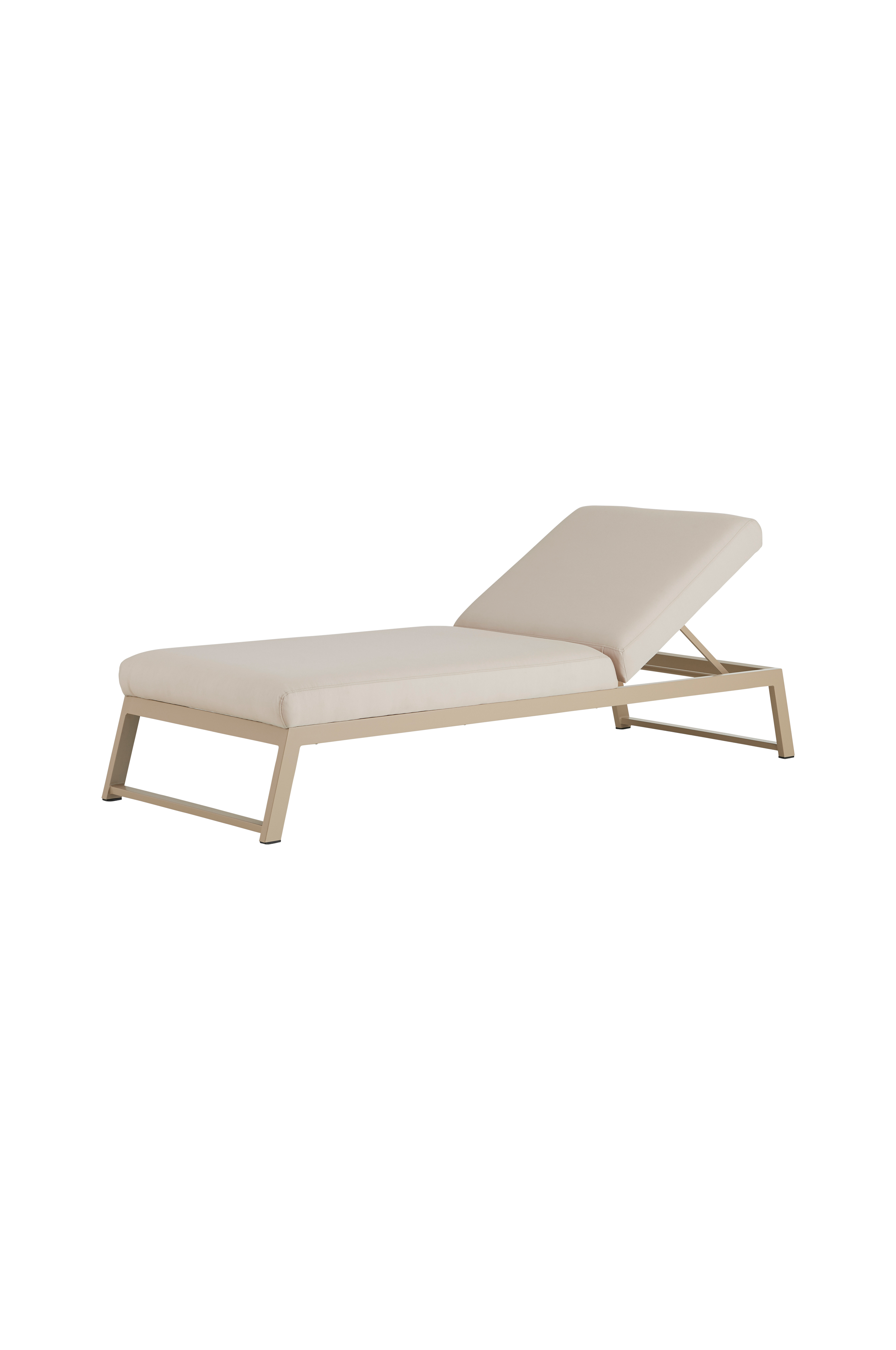 Solseng i pulverlakkert metall med tilhørende puter. Justerbart ryggstø i 5 nivåer.