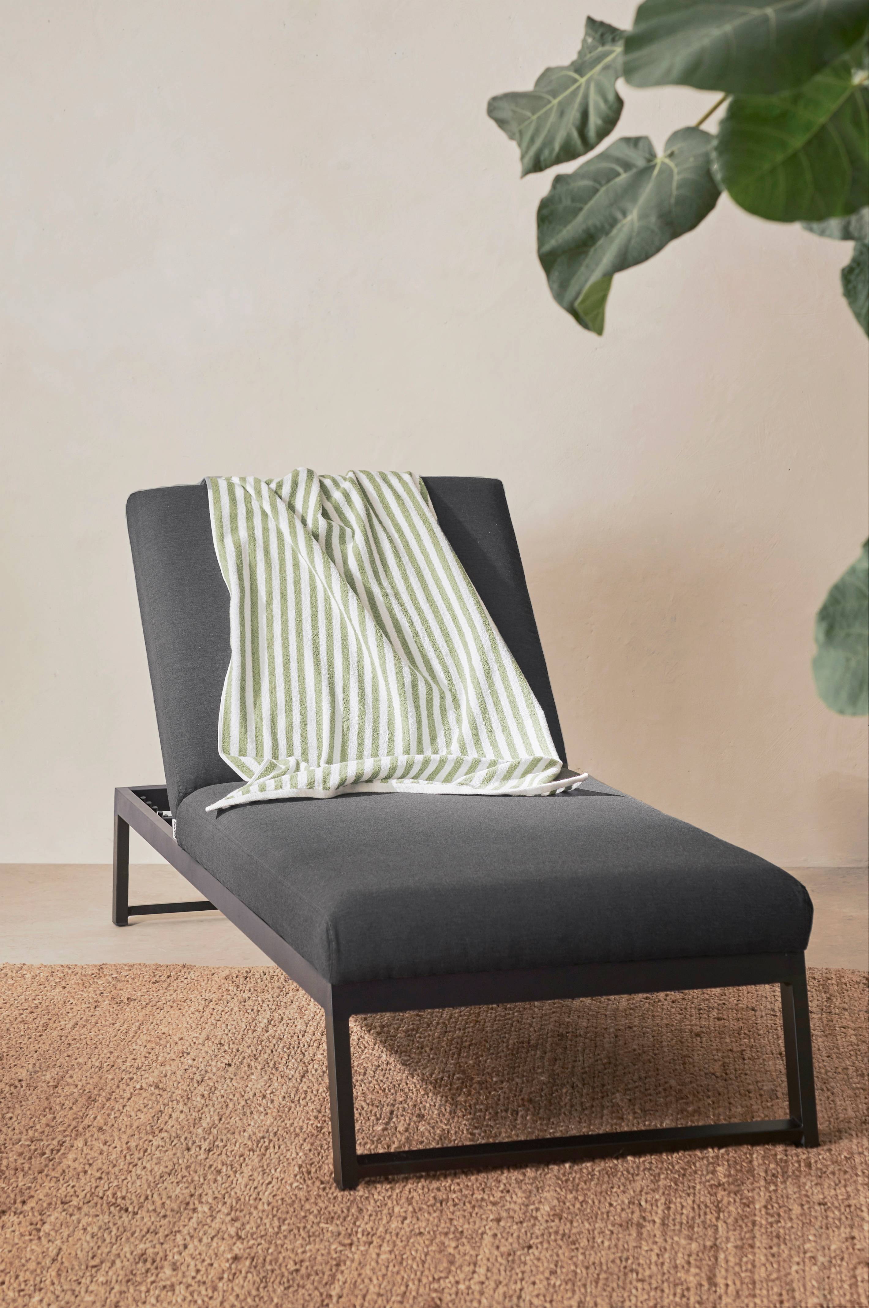 Solseng i pulverlakkert metall med tilhørende puter. Justerbart ryggstø i 5 nivåer.