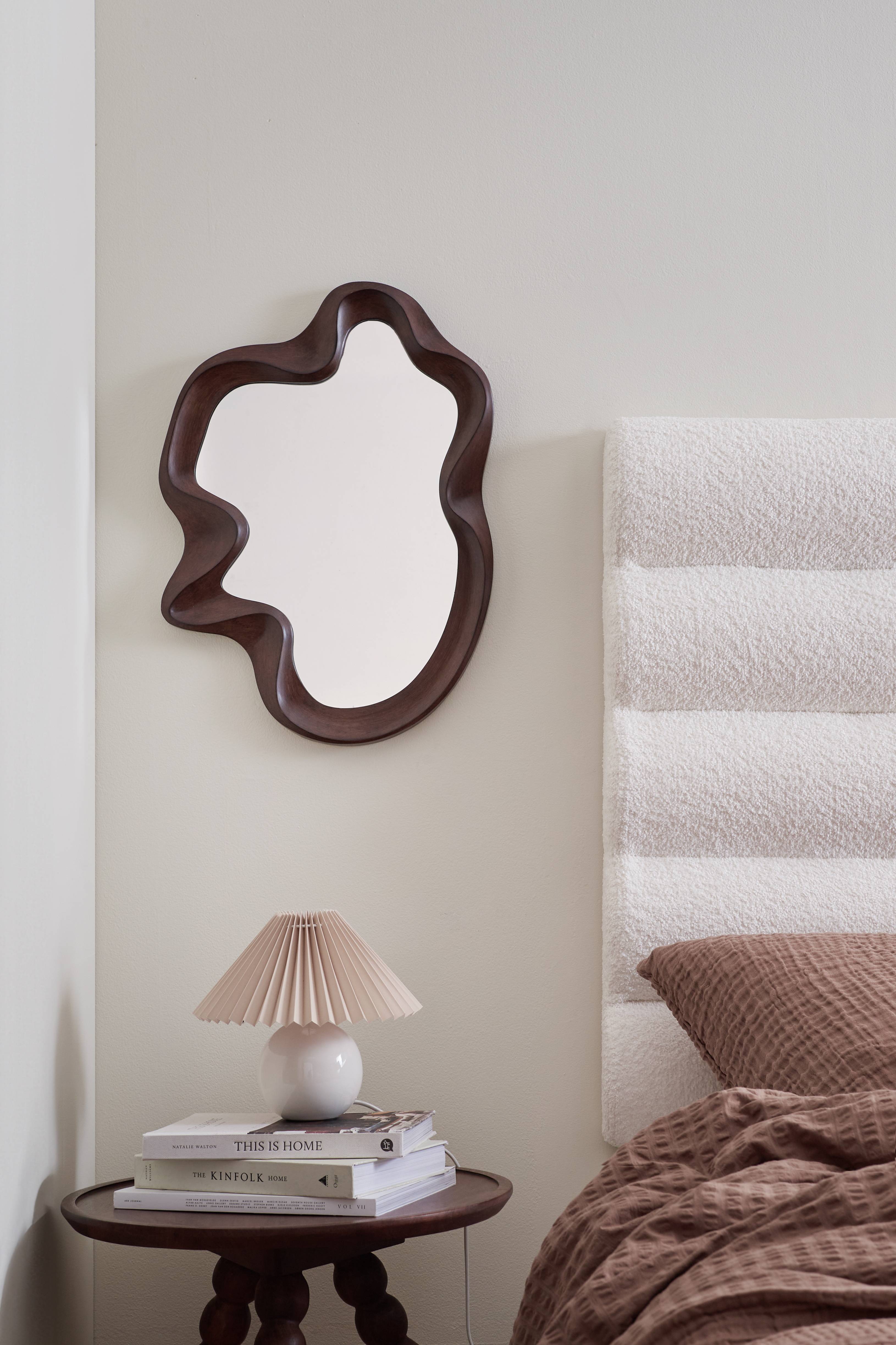 Speil med uregelmessig, organisk form. Ramme av tre. Veggfester på baksiden.