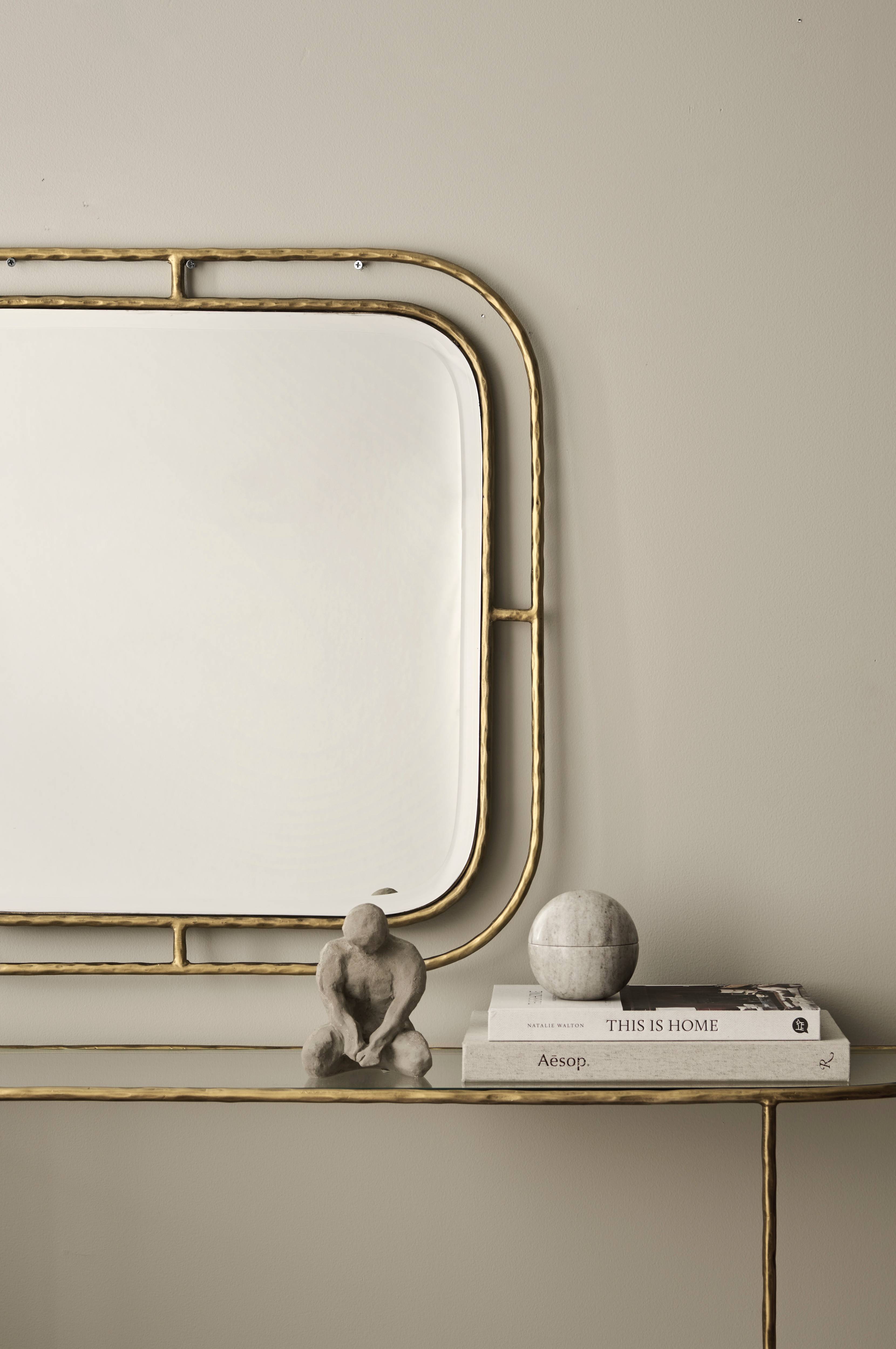 Speil med faset kant rundt og doble metallkanter med hamret tekstur. Leveres montert.