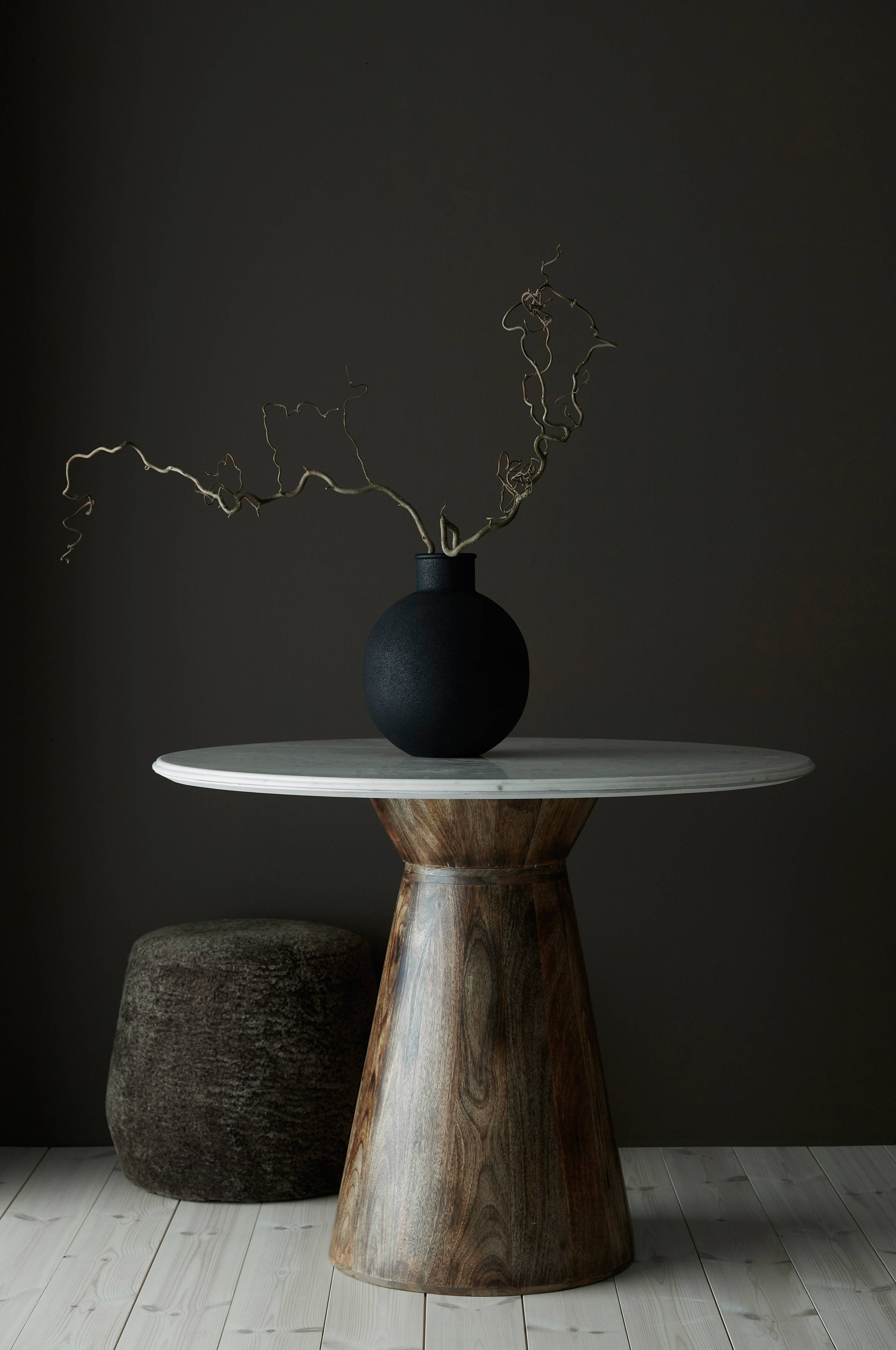 Rundt spisebord med understell i vokset mangotre og bordplate i marmor med faset kant. Mål: Høyde 76 cm. Diameter bordplate 100 cm. Diameter nederst på understellet 48 cm. Enkel montering.