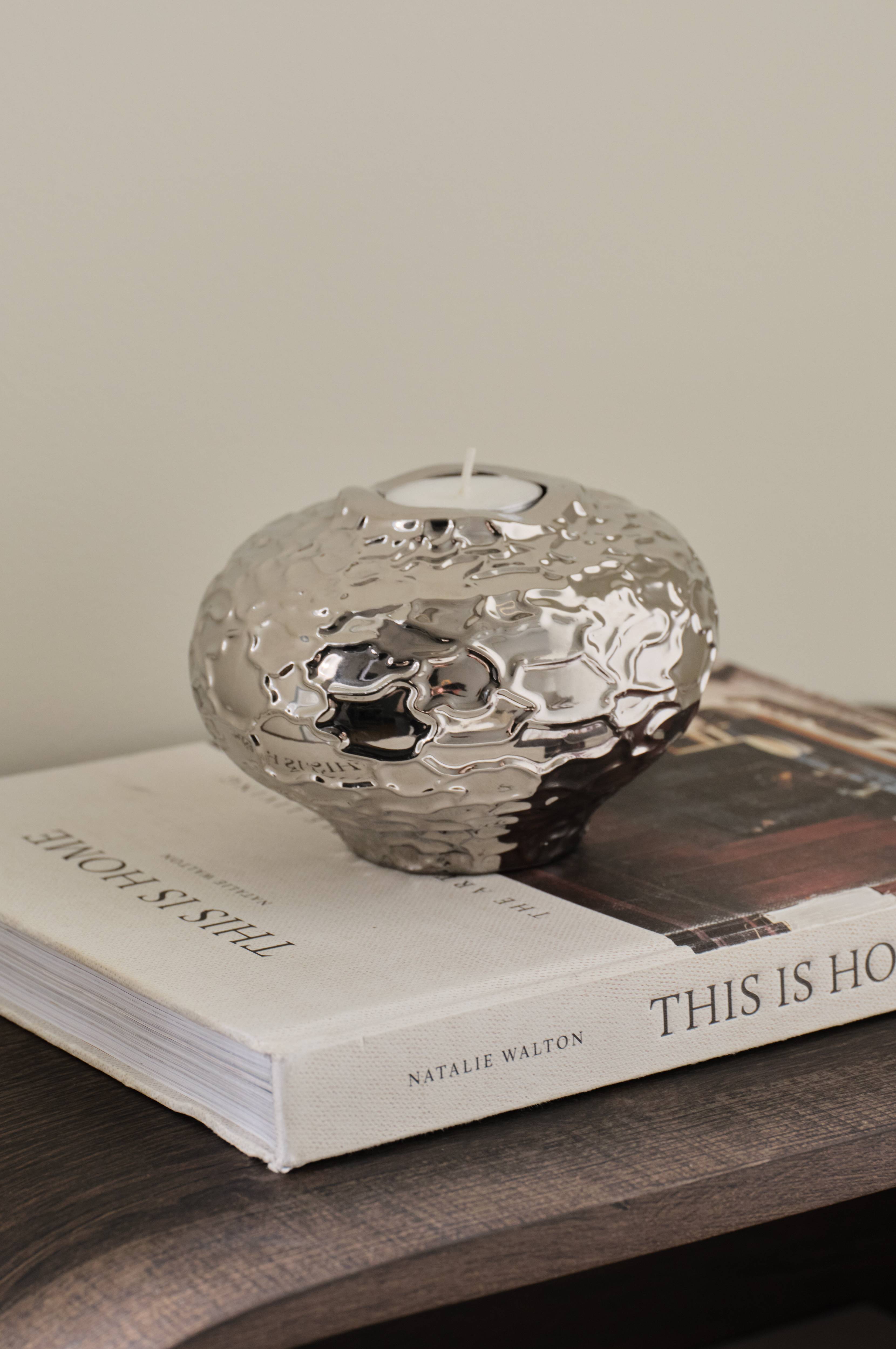• Stearinlys i kjeramikk med sølvfarget, metallisk overflate• Kan brukes med både telys og lysekroner