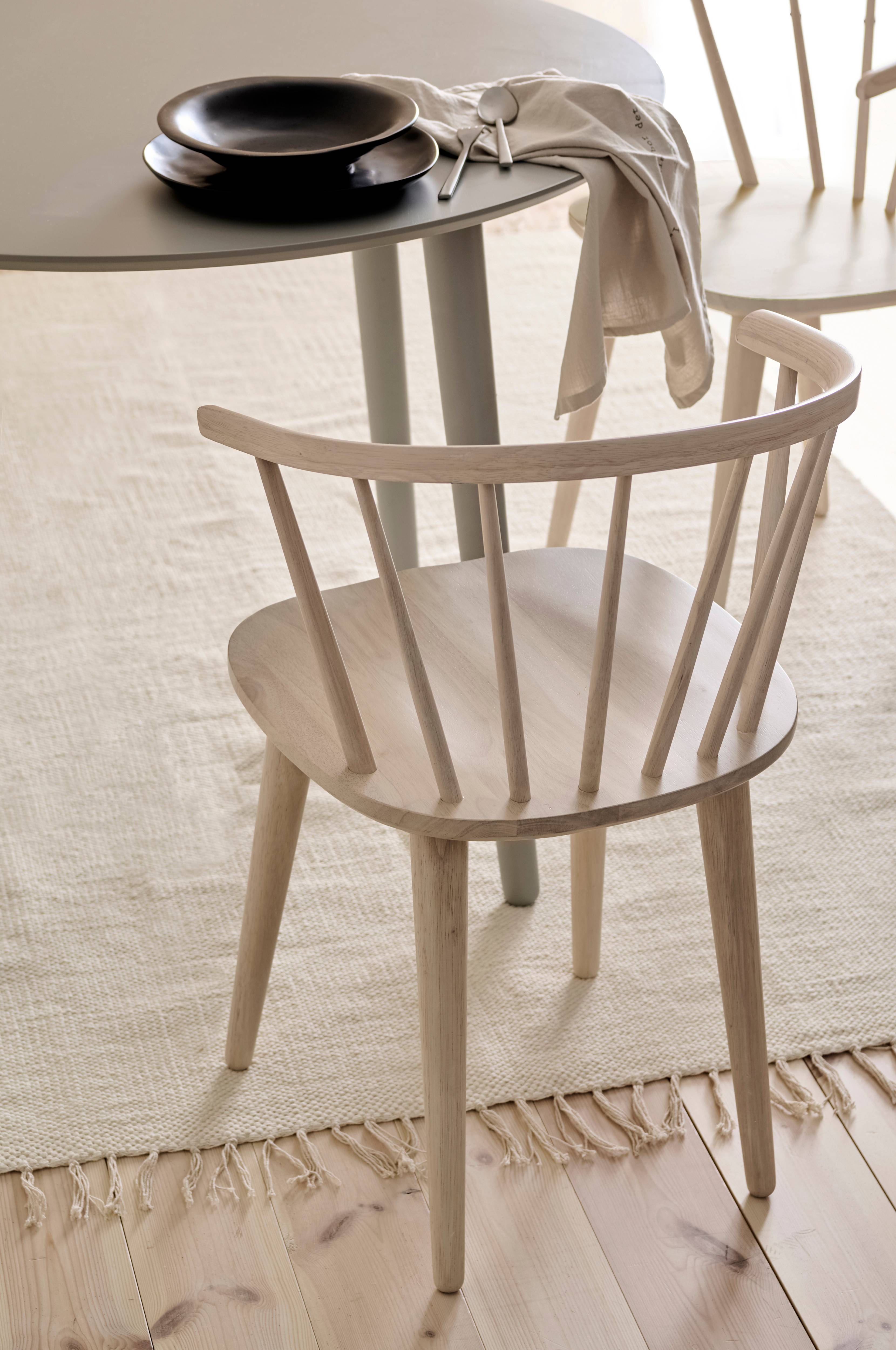 Stol med armlener av massivt gummitre. Høyde 76 cm. Bredde 54 cm. Dybde 51 cm. Sittehøyde 45 cm. Sittedybde 40 cm. Leveres umontert (kun bena må skrues på ved levering)