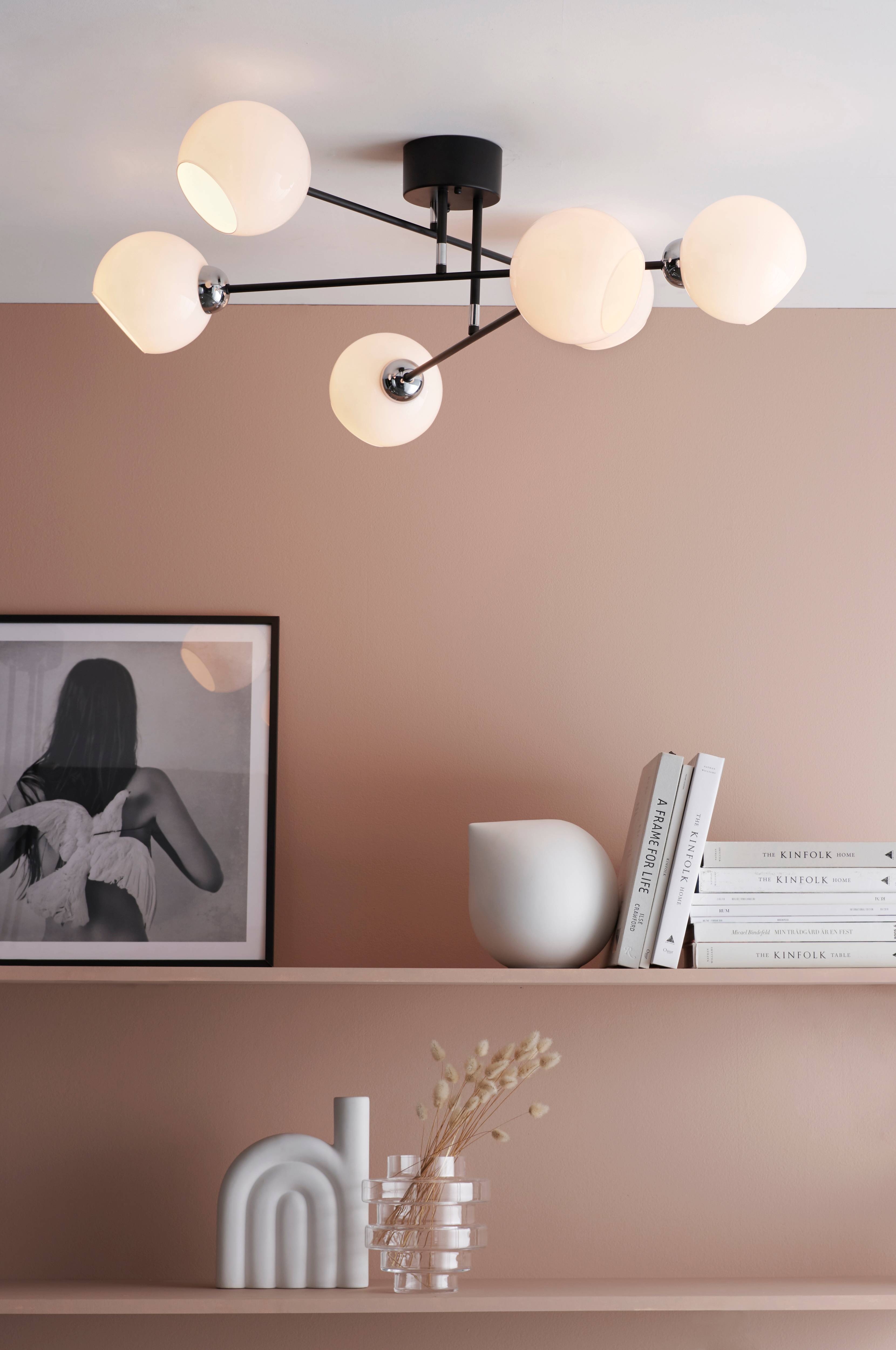 Taklampe av metall i matt, svart finish og med 3 armer. 6 opalhvite glasskjermer med forkrommede detaljer. Armene er justerbare sideveis. Total høyde på lampen er 31 cm. Lengde på armene inkl. glasskjermer 87 cm. Ø på glasskjerm 15 cm. Takkopp med krokoppheng. Stor sokkel 6 x E27, maks 40 W. Lyspærer selges separat. Jordet.