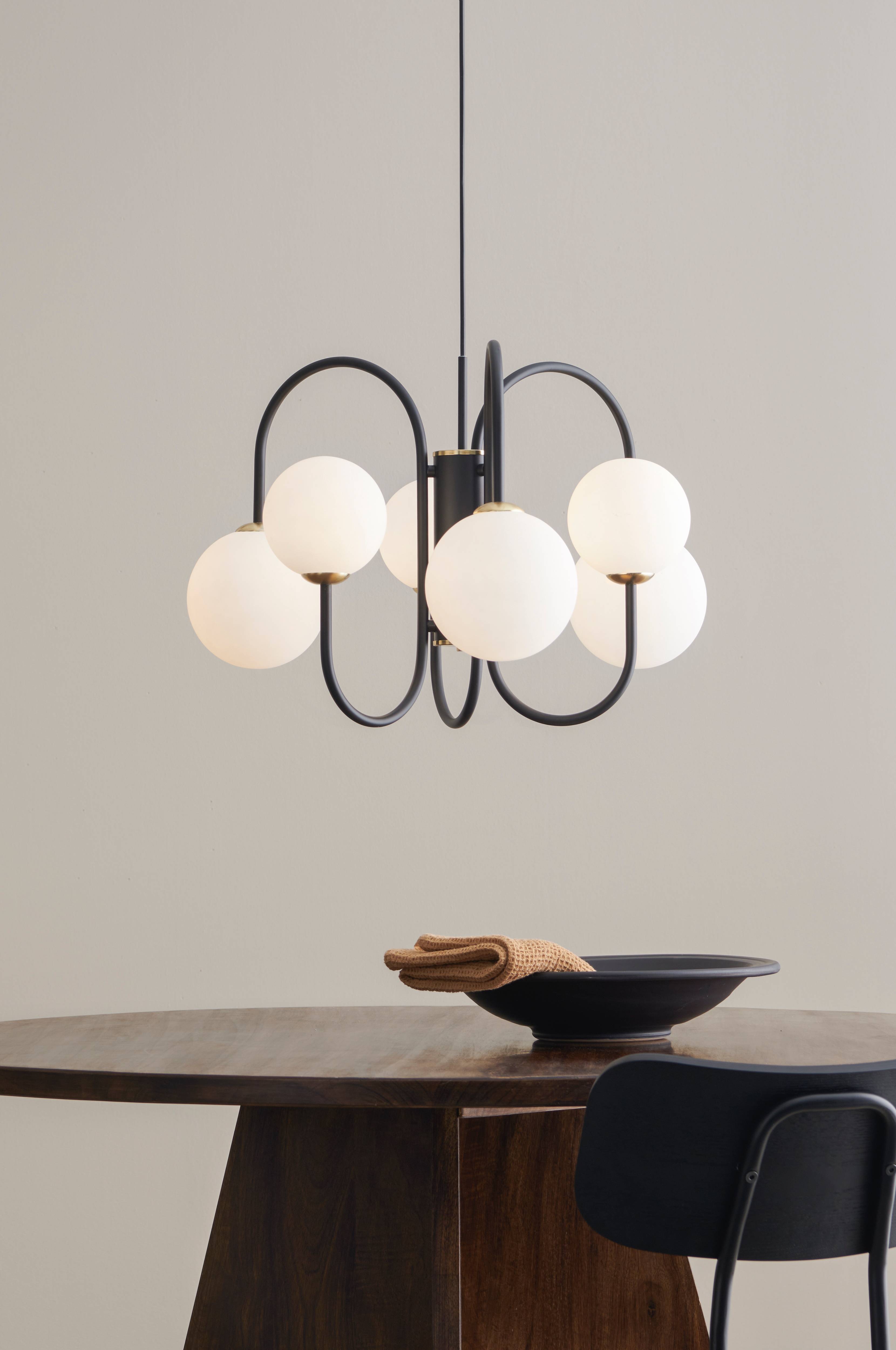 Taklampe i mattsvart metall med detaljer i børstet messingfarge. Opalhvite glasskupler i matt finish i to ulike størrelser (3 store, 3 små). 6 armer med kupler som festes/løsnes ved å skru. Mål på glasskupler: 3 x Ø 130 mm, 3 x Ø 150 mm. Ø nederst 61 cm. Total høyde ca. 165 cm, kan avkortes til ønsket høyde. Svart ledning, ledningslengde 1,2 m. Takkopp med brakettoppheng. Sokkel 6xG9. Maks. 5 W. Lyspærer selges separat.