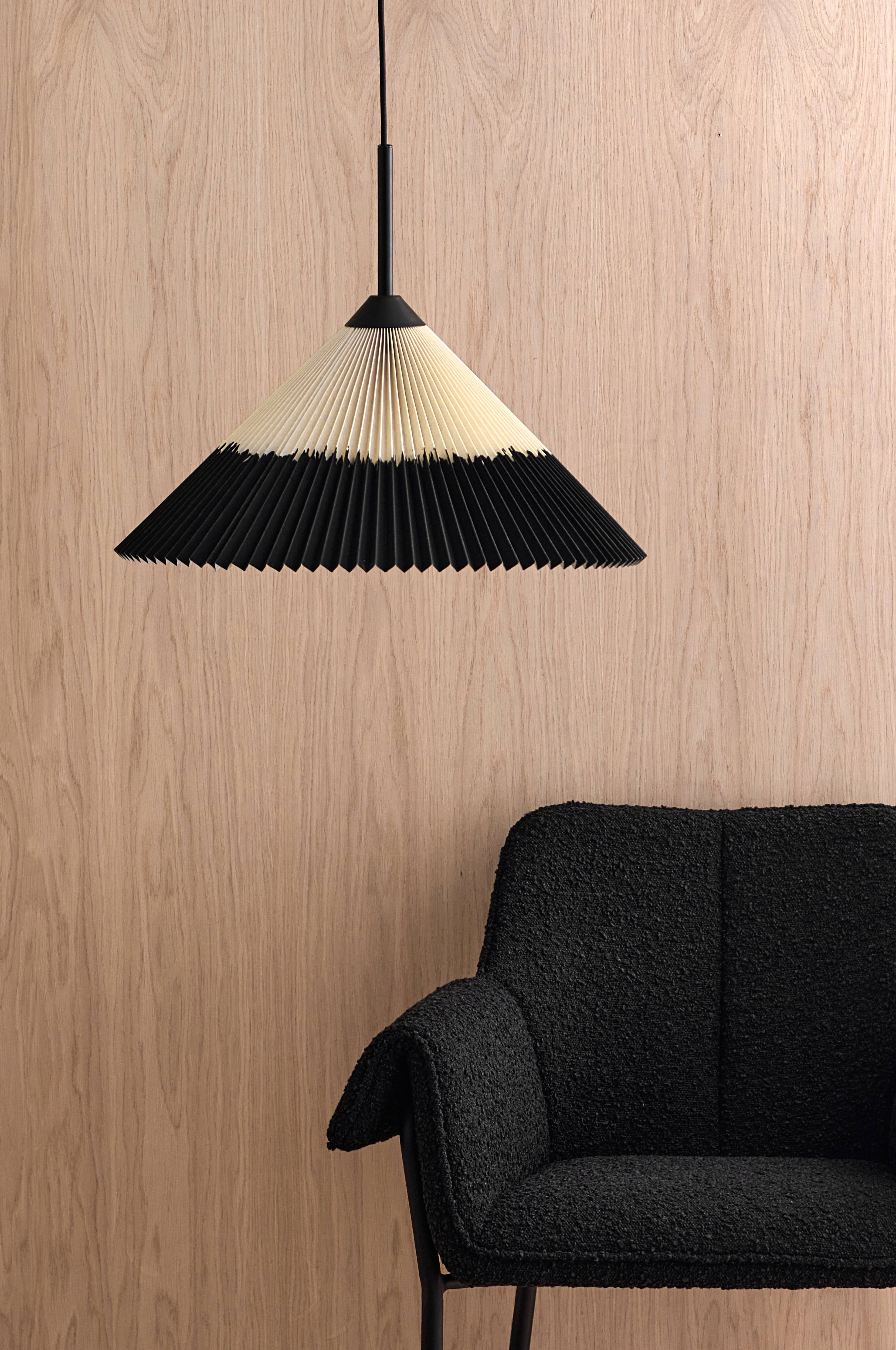 Taklampe med skjerm i plissert tekstil og detalj av metall i mattsvart finish. Skjermens mål: Diameter 55 cm, høyde 27 cm. Total høyde fra tak ca. 157 cm, kan kortes til ønsket høyde. Svart tekstilkledd ledning og svart, kjegleformet takkopp i plast. Monteres med krokoppheng. Lyspære er ikke inkludert. Jordet.