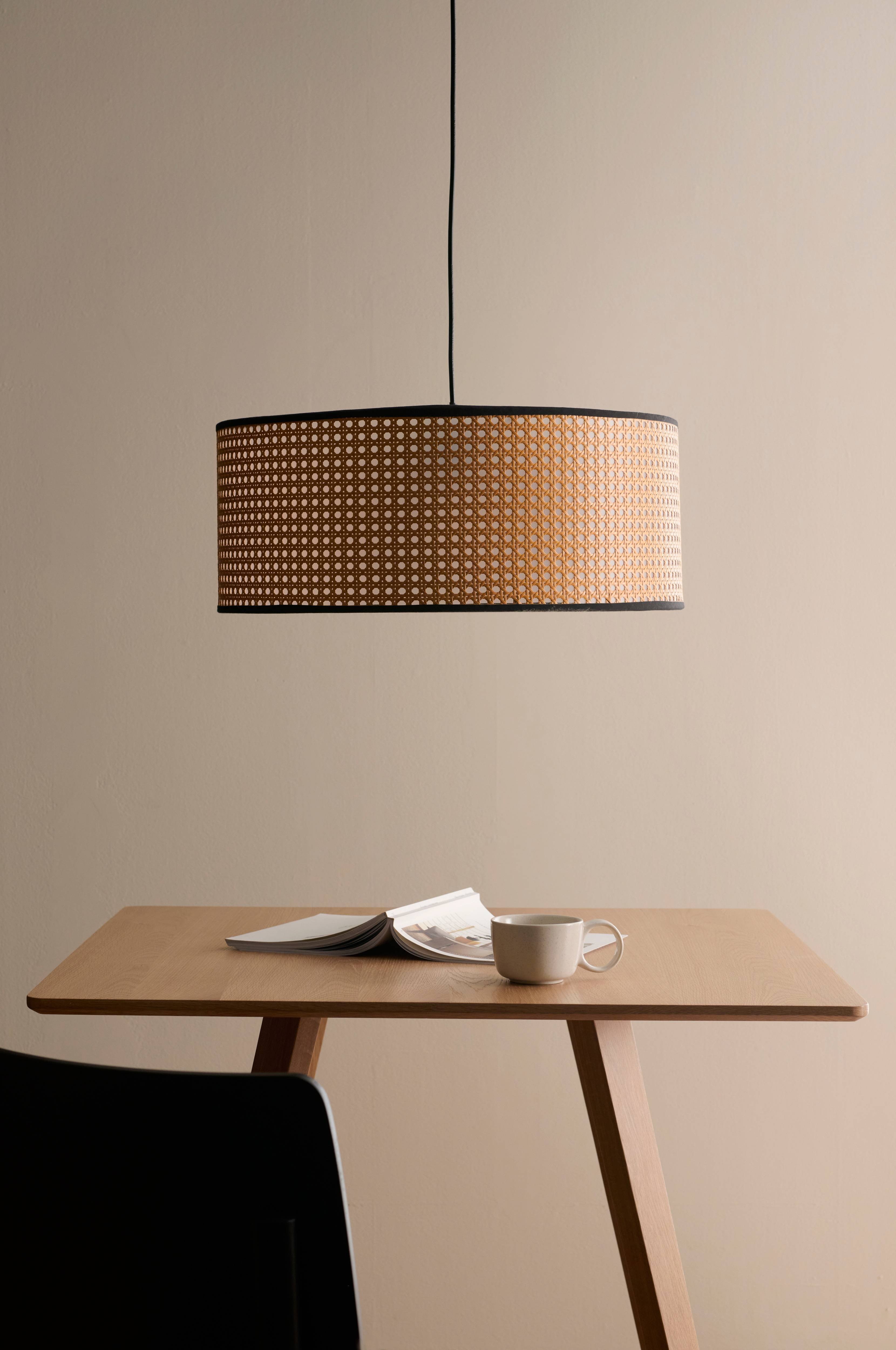 Taklampe med skjerm av naturfarget kunstrotting og stamme av metall i mattsvart finish. Svart ledning og svart takkopp i plast. Total høyde fra tak ca. 140 cm. Monteres med krokoppheng. Lyspære er ikke inkludert. Ikke jordet.
