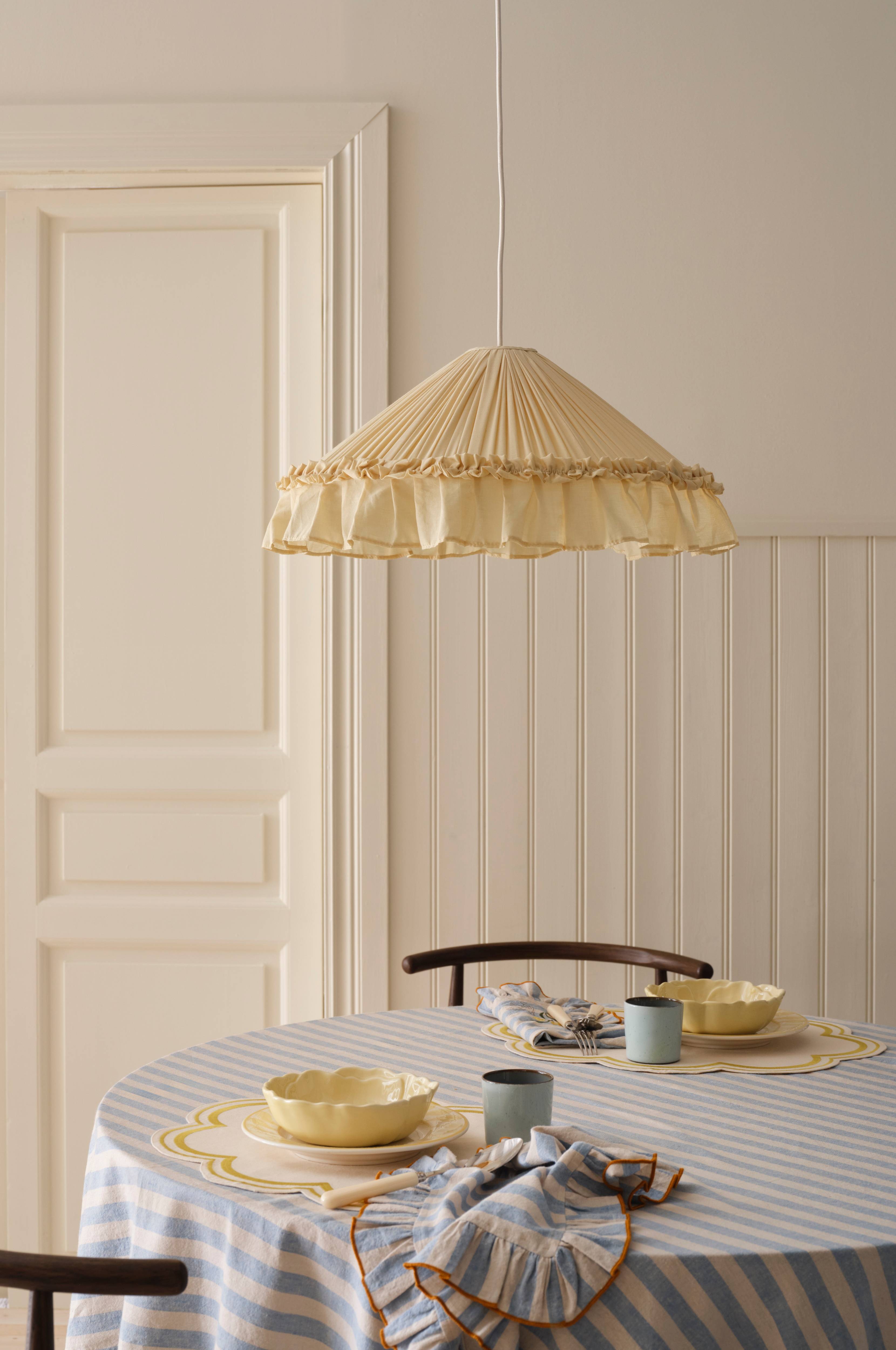 • Plissert taklampe i bomull med kledd innside og dekorativ volangkant• Metallramme• Takkopp i plastikk• Tekstilledning• Krokoppheng• Lyspære er ikke inkludert• takkontakt ikke inkludert (kjøpes separat)