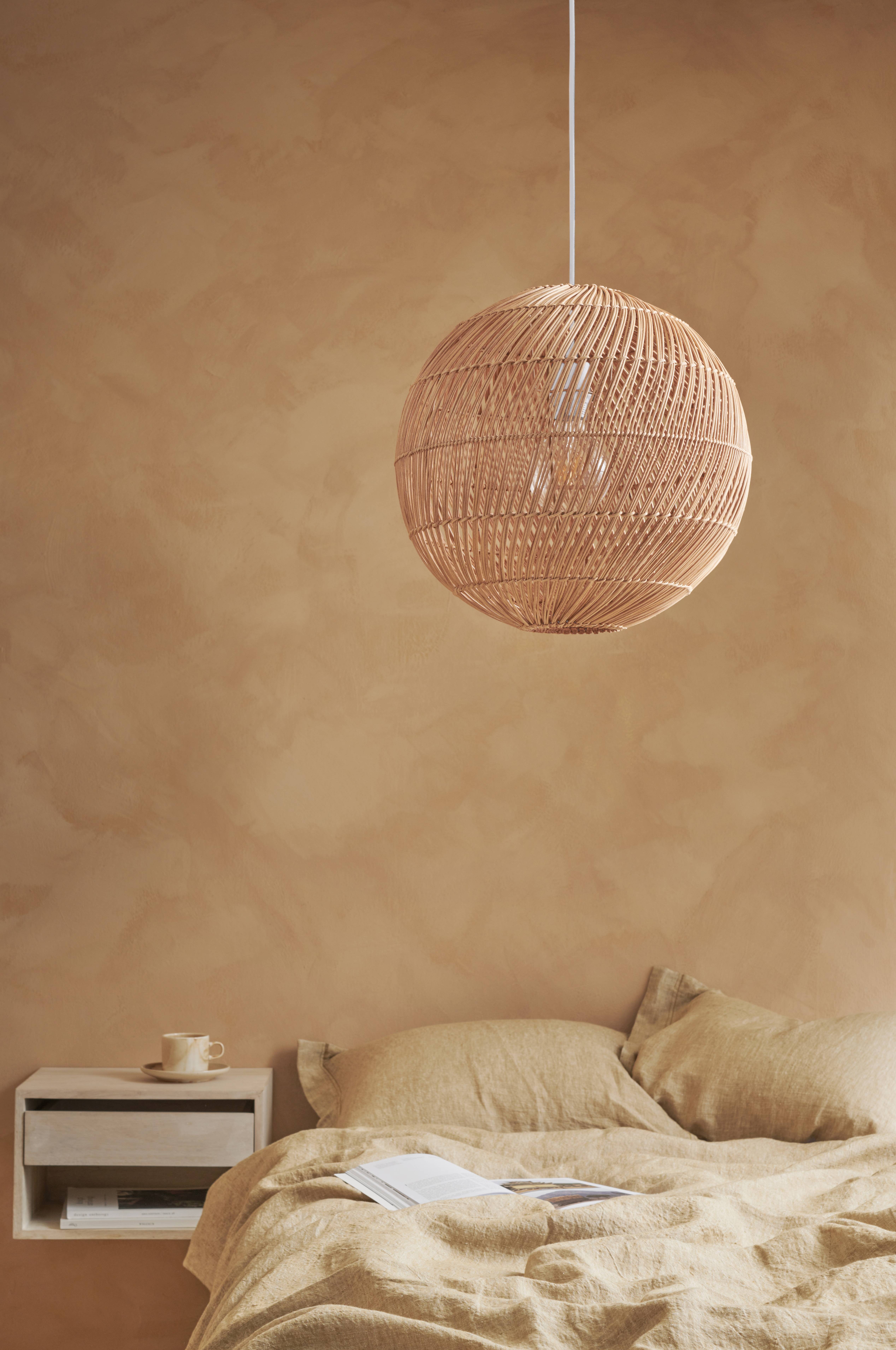 Taklampe av rotting med tekstilkledd ledning. Takkopp av metall. Takkoppens mål: Diameter 12 cm, høyde 6 cm. Total høyde fra tak ca. 162 cm, kan kortes til ønsket høyde. Monteres med krokoppheng.