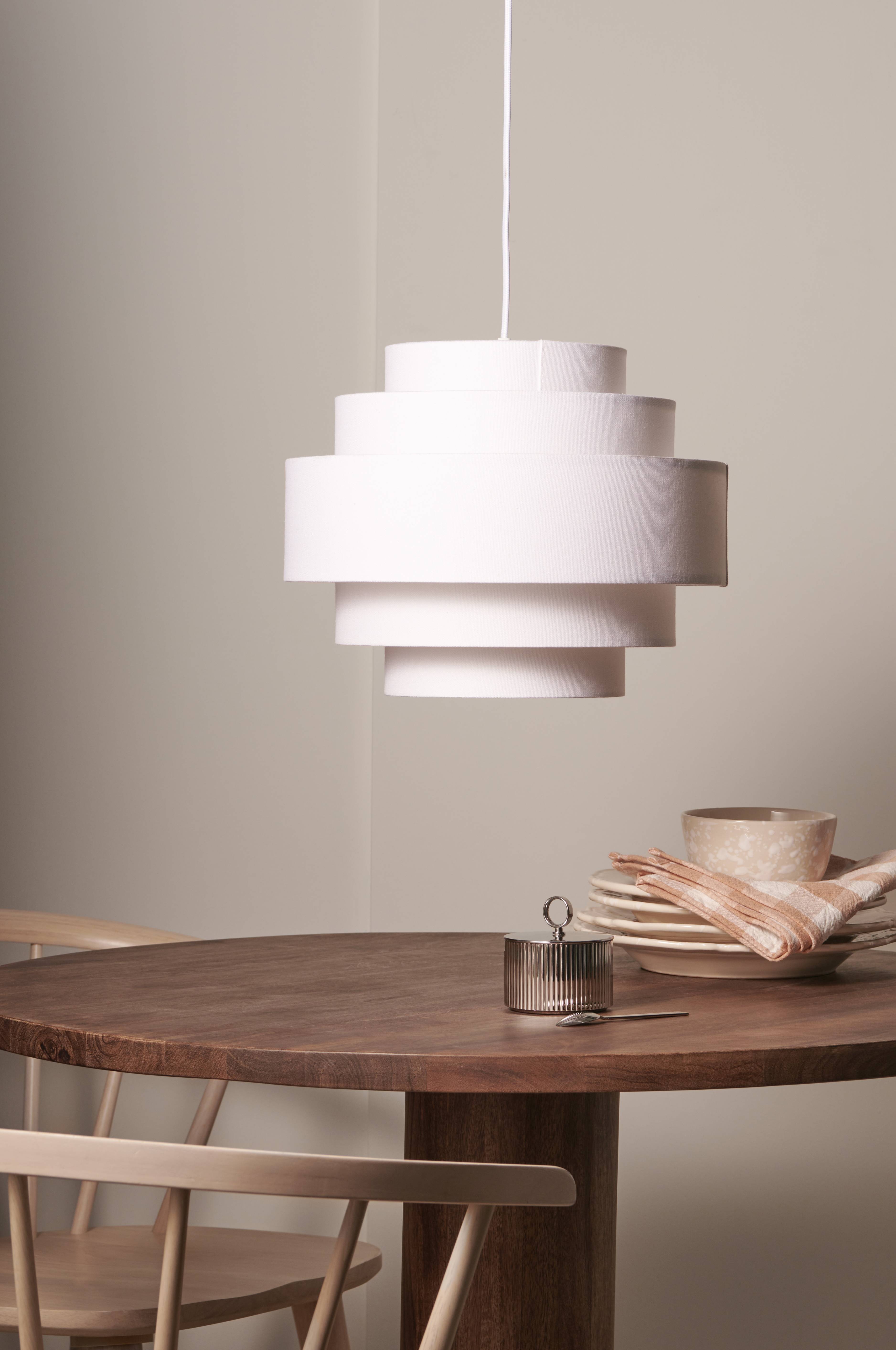 Taklampe med skjerm av tekstil i flere seksjoner i ulike størrelser, Ø ca. 35 cm. Høyde 28 cm. Takkopp i plast med krokoppheng og direktekobling (ingen støpsel). Ledningslengde 120 cm.