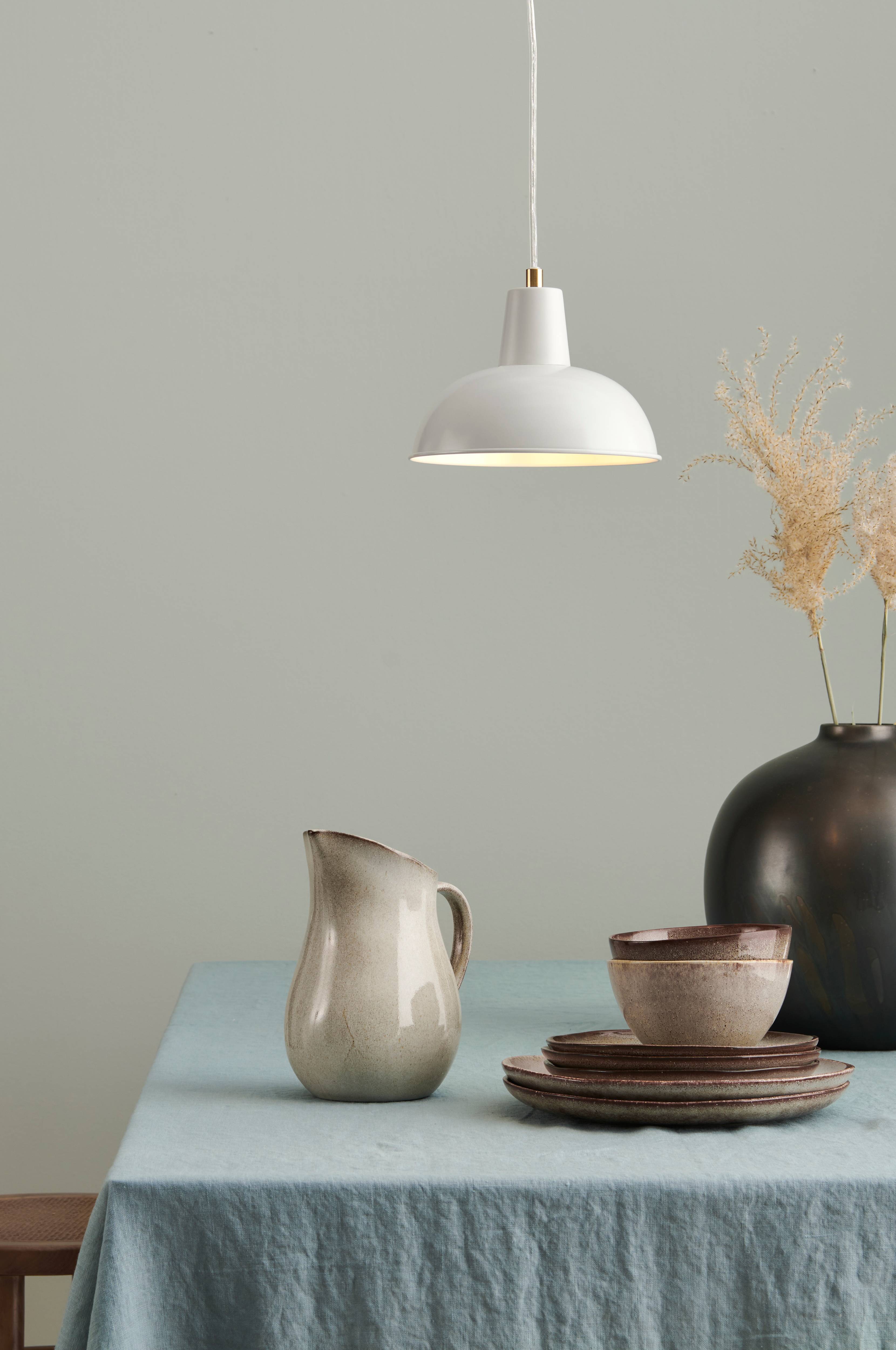 Taklampe med skjerm av matt, malt metall med hvit, blank innside. Takkopp av metall. Skjermens høyde 13 cm, Ø ca. 20 cm. Total høyde fra taket er ca. 150 cm, kan avkortes til ønsket høyde. Transparent ledning, ledningslengde 120 cm. Krokoppheng. Sokkel E14. Maks 30W. Lyspære er ikke inkludert.