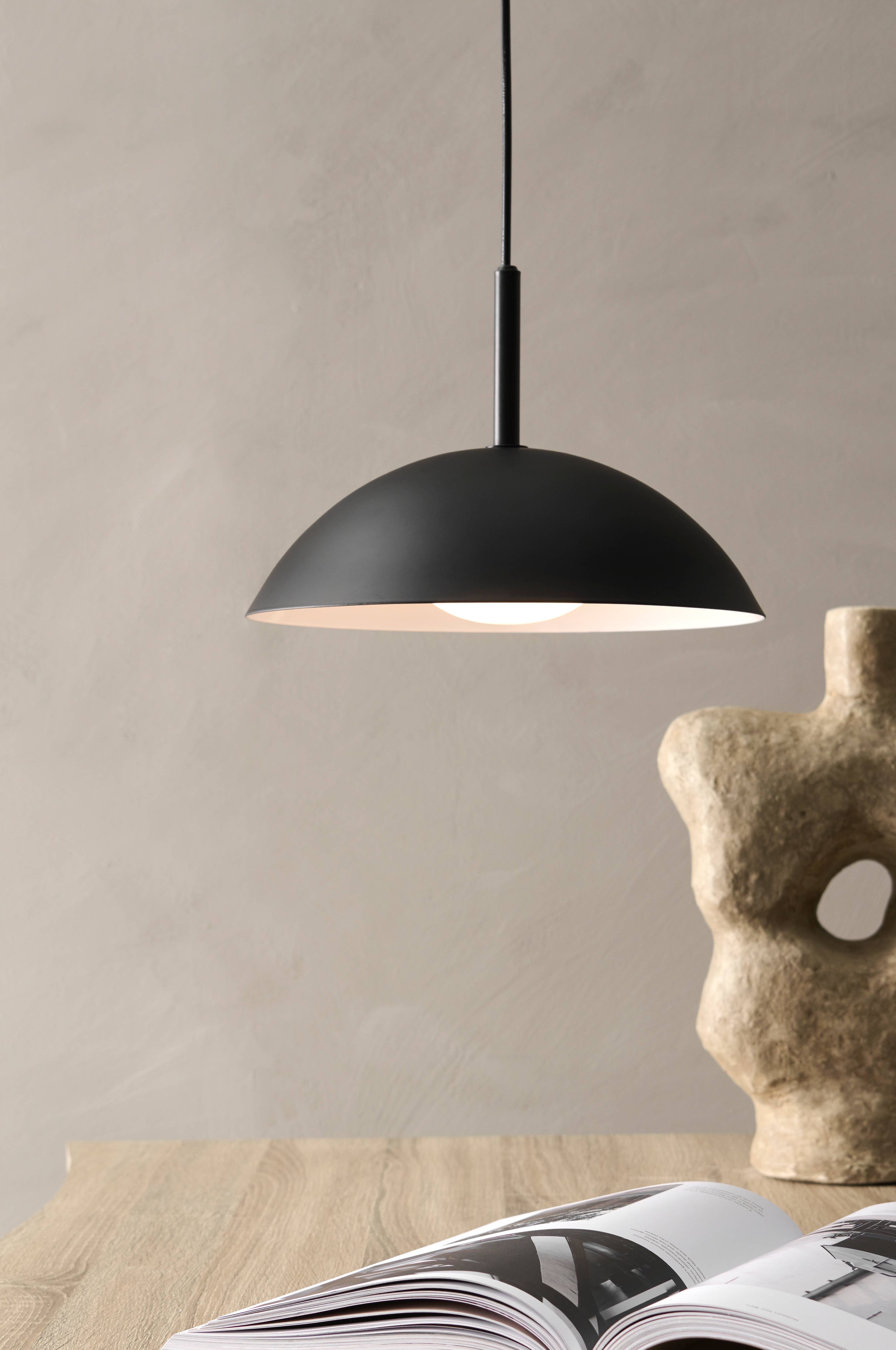 Taklampe med skjerm av metall og ellipseformet glasskuppel av opalhvitt glass.