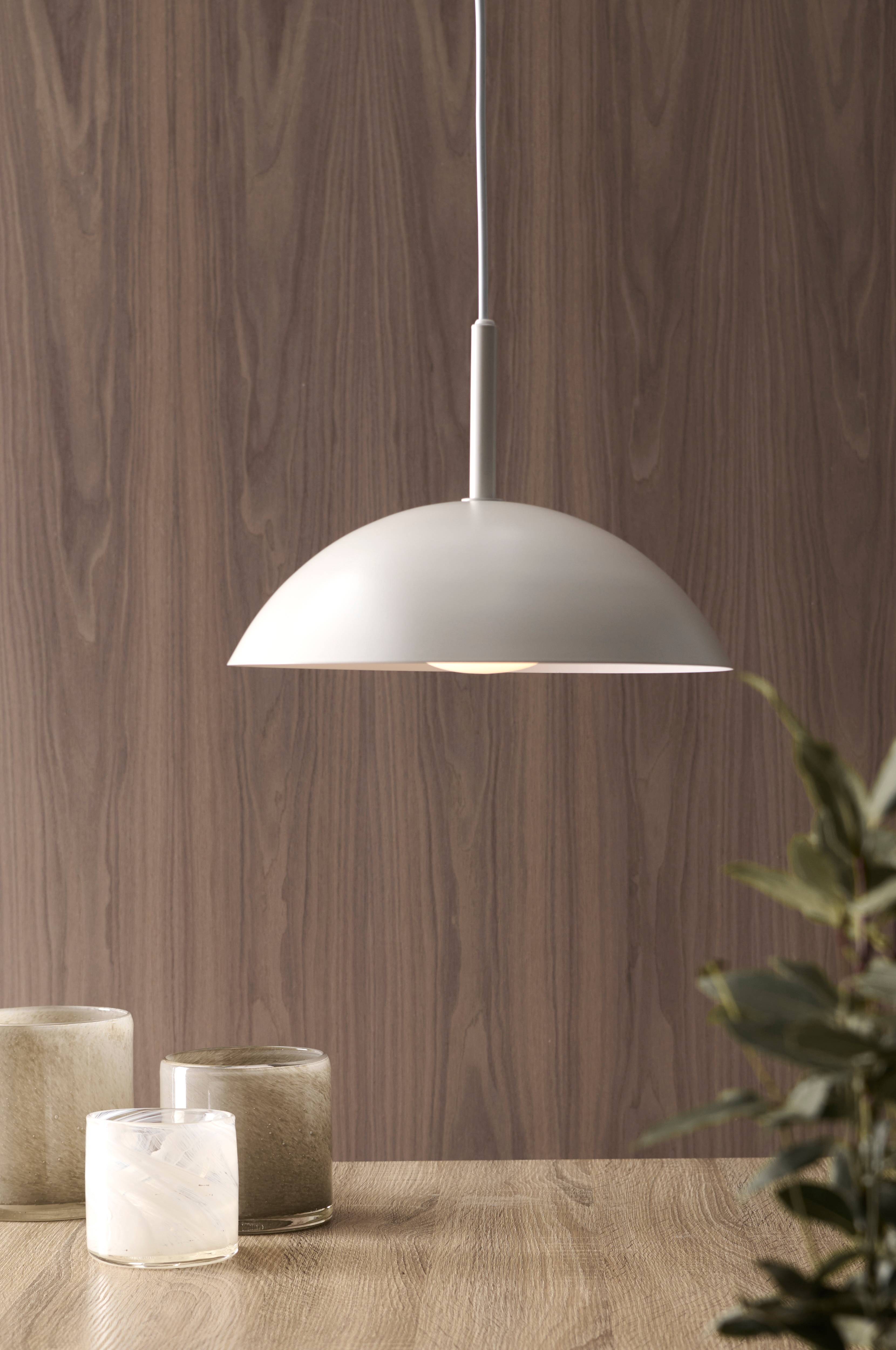 Taklampe med skjerm av metall og ellipseformet glasskuppel av opalhvitt glass.