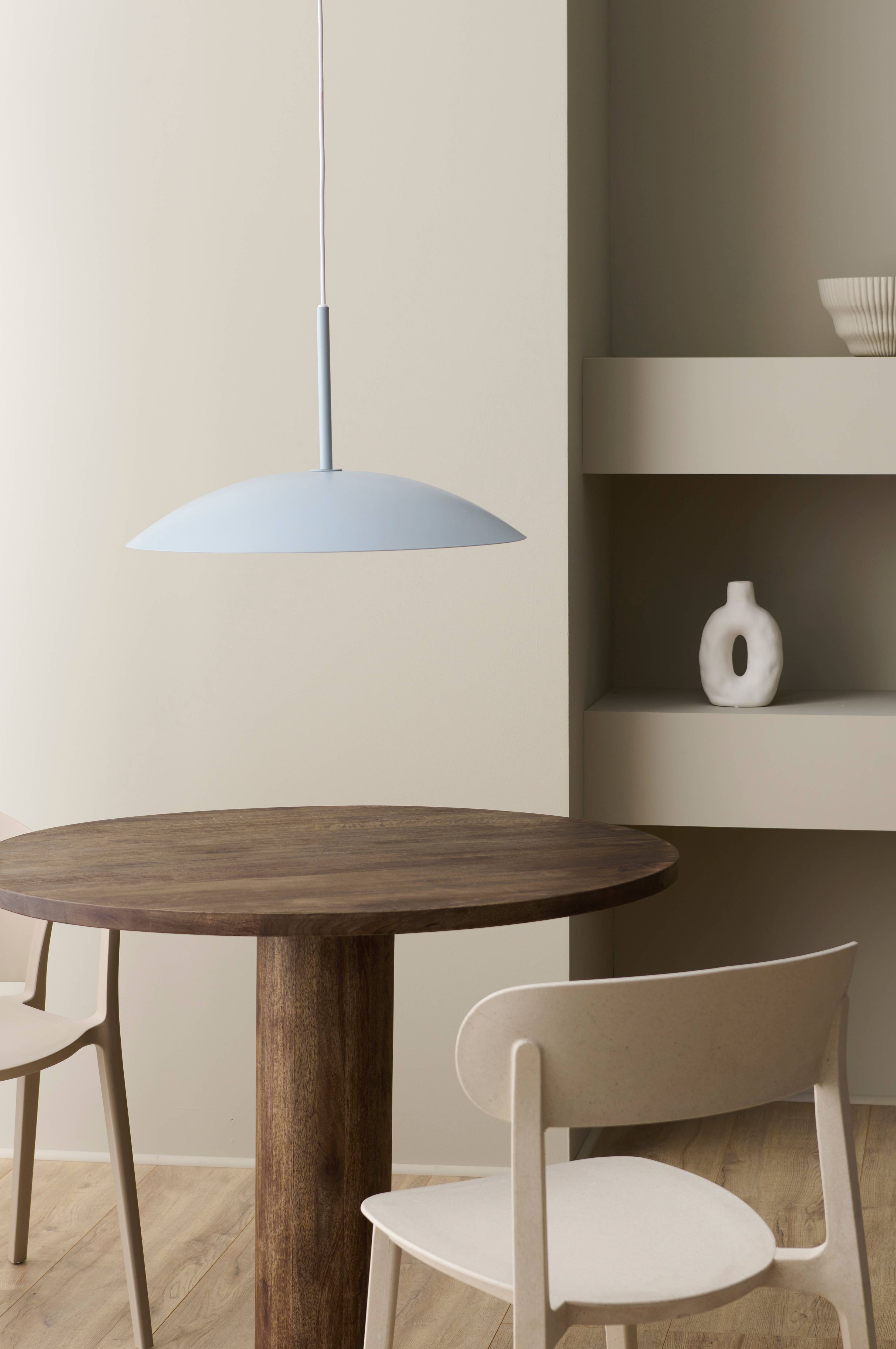 Taklampe med skjerm av metall og ellipseformet glasskuppel av opalhvitt glass. Takkopp i metall. Mål på skjermen: Høyde 10 cm, diameter 50 cm. Glasskuppelens mål: Høyde 9,5 cm, diameter 12 cm. Plastledning, total høyde fra tak ca. 165 cm, kan kortes til ønsket høyde. Monteres med krokoppheng. Lyspære er ikke inkludert. Jordet. Takkontakt er ikke inkludert på grunn av nytt EU-direktiv. Takkontakt kan kjøpes separat.