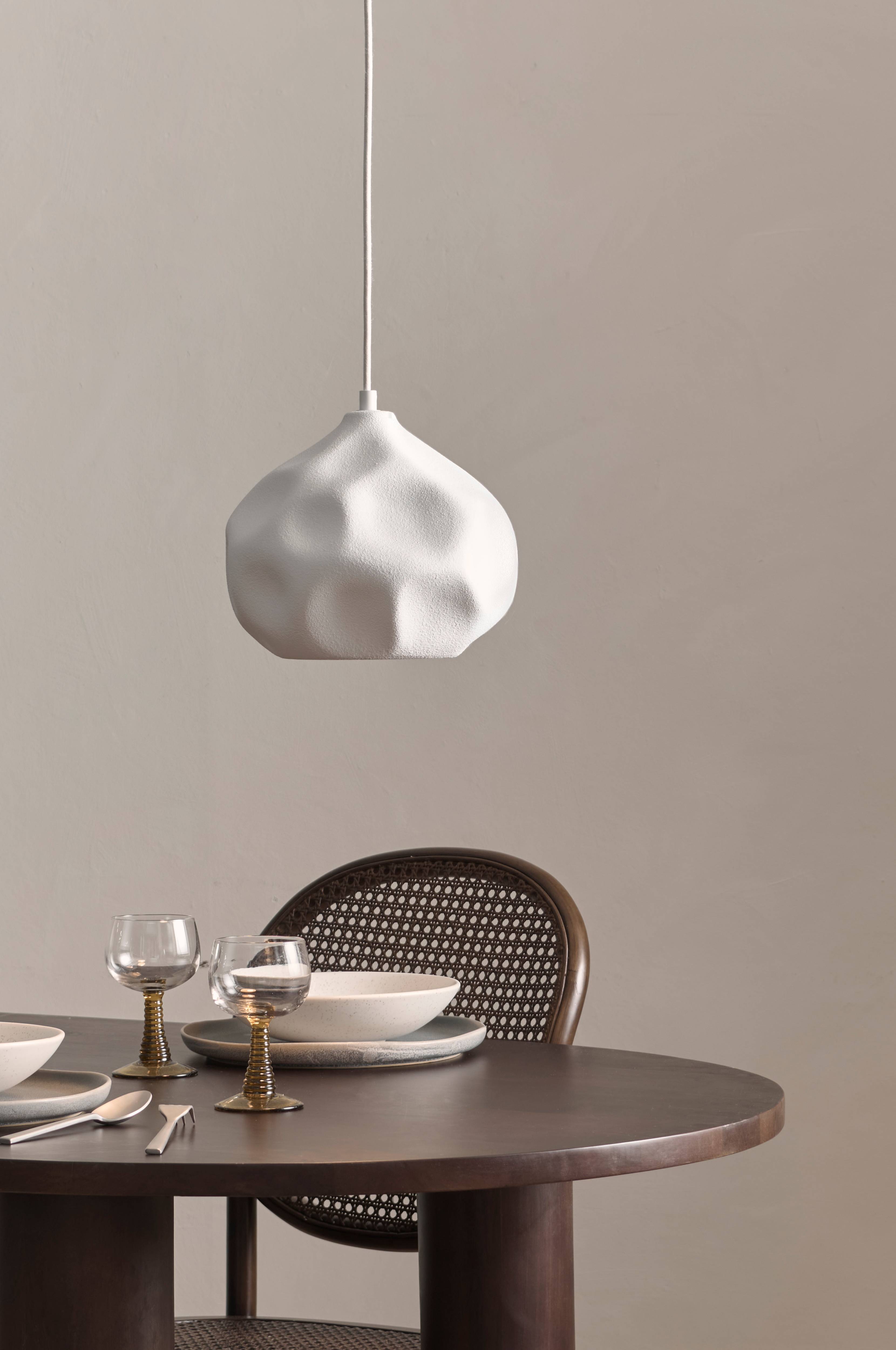 Taklampe av steintøy i matt sandsteinsfinish med vakker organisk form. Takkopp i metall. Høyde fra tak ca. 145 cm, kan kortes til ønsket høyde. Hvit tekstilledning. Monteres med brakett. Lyspære er ikke inkludert.