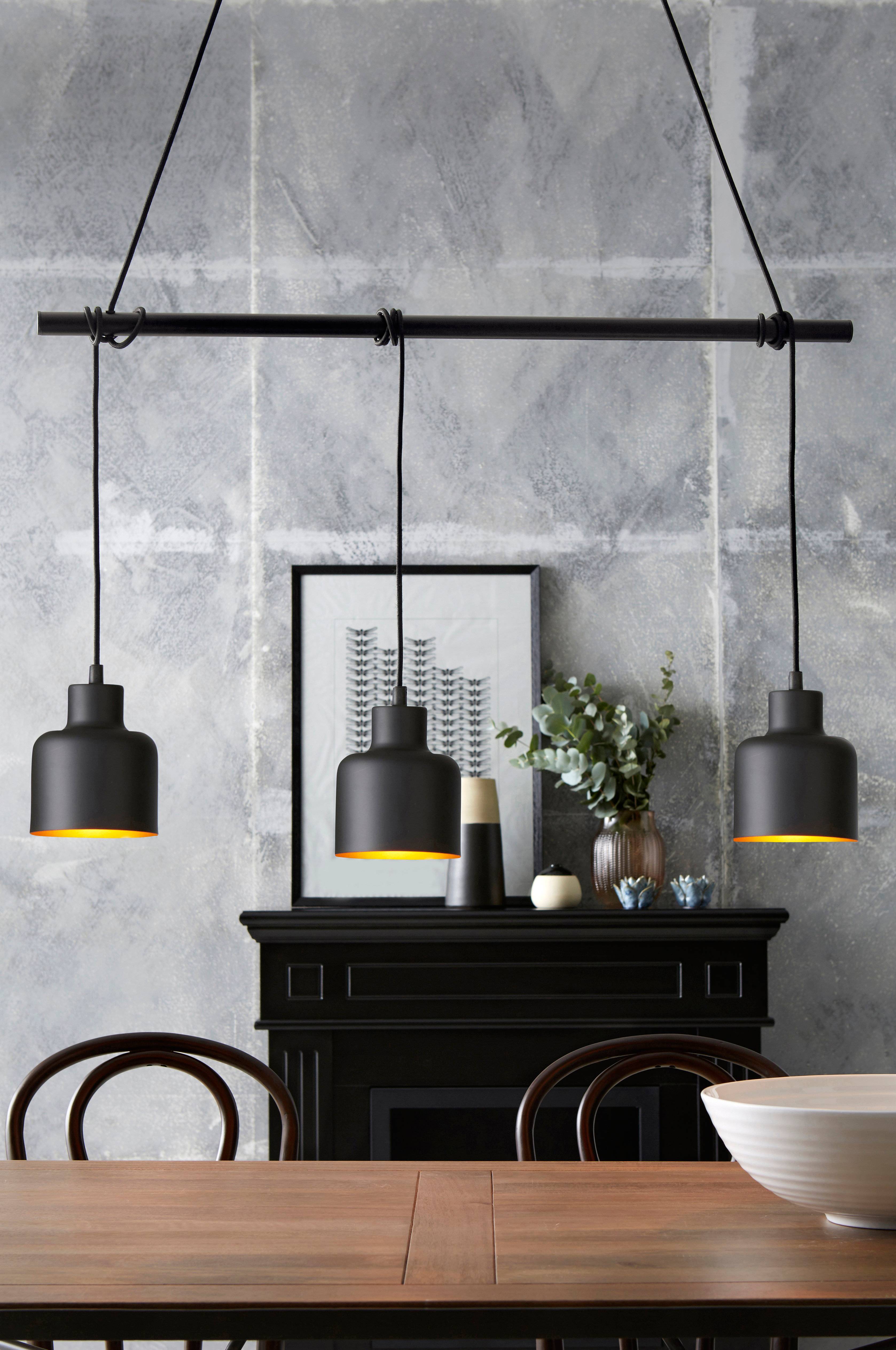 Pendel med 3 lamper i svart tekstilkledd ledning. Justerbar høyde med ledninger tvunnet rundt en tverrgående stålpinne (pinnens lengde 90 cm). Ledningslengde 150 cm. Lampeskjermer av stål med gullfarget innside, skjermenes mål: Ø 14 cm, høyde 17 cm. Takkopp med bøyle og takkontakt. Stor sokkel E 27. Maks 40 W.