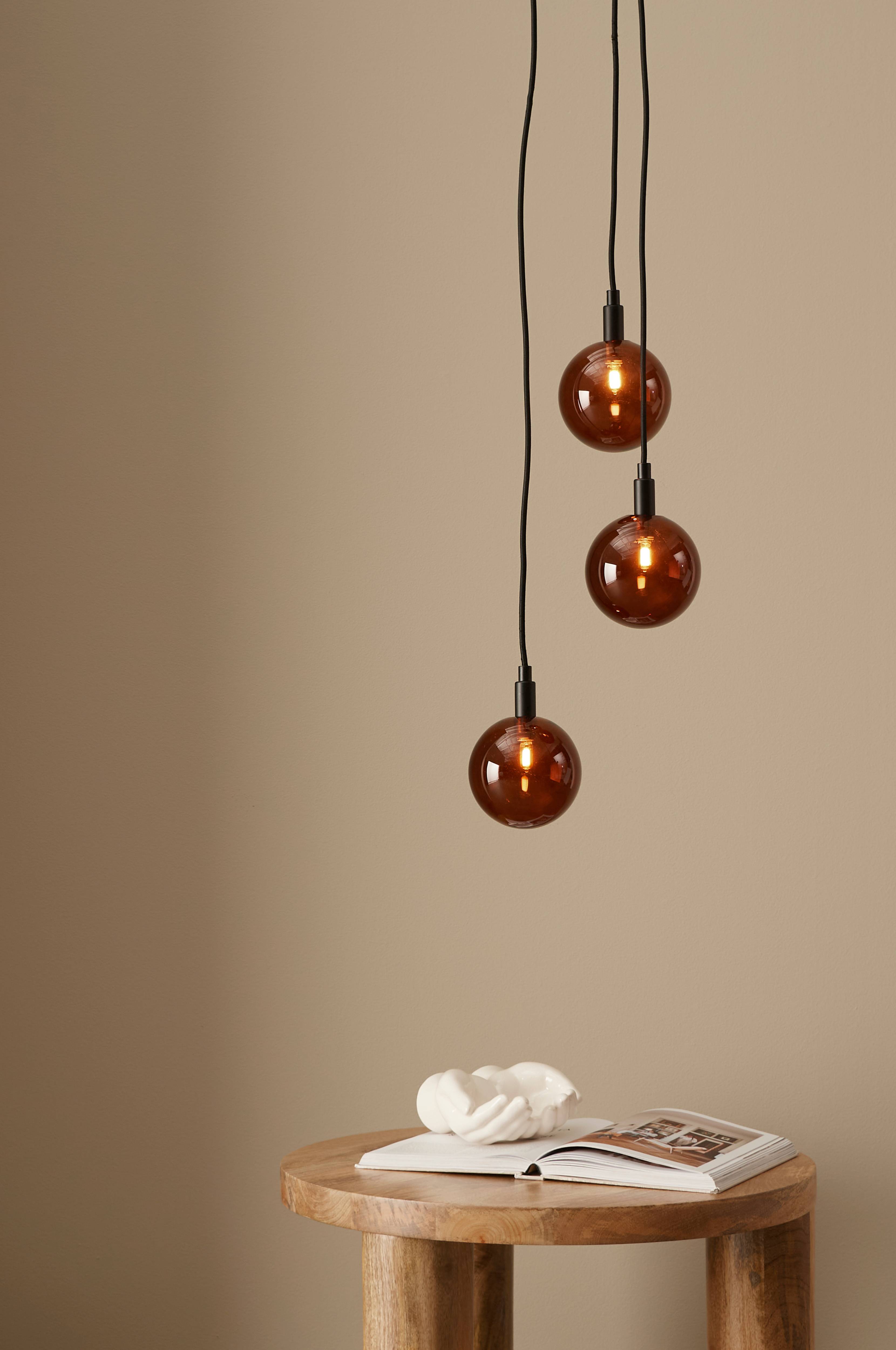 Taklampe med en base i antikkfarget metall med 3 glasskupler. Totale mål: Bredde 25 cm, total høyde 167 cm, dybde 25 cm. Diameter på glasskuppelen 12 cm. De tre svarte, tekstilkledde ledningene er 1,1, 1,3 resp. 1,5 meter, og kan forkortes. Henges opp med takbøyle. Sokkel 3xG9. IP-klasse 20. Maks 20W. Ikke jordet. Lyspærer er ikke inkludert.