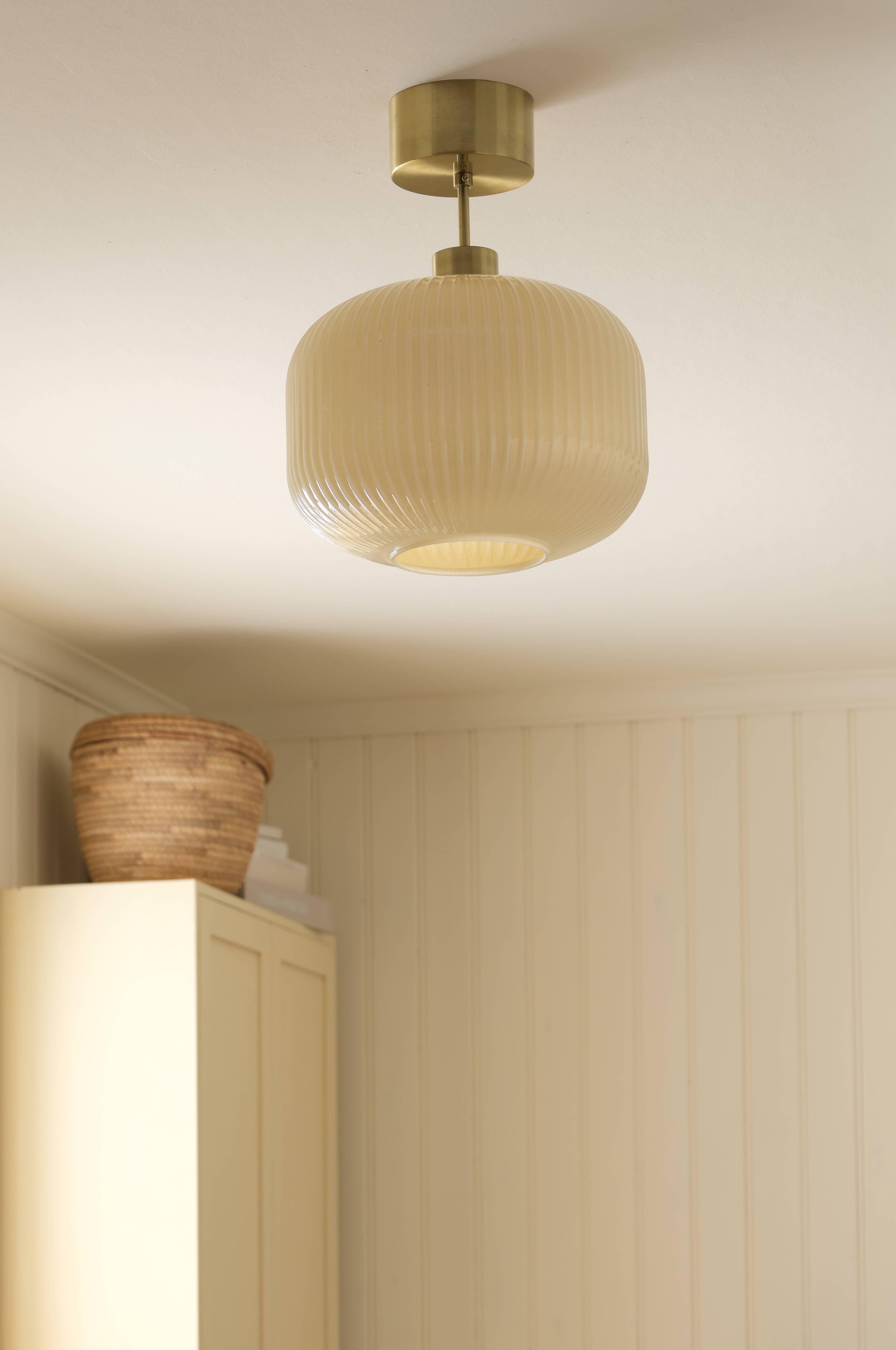 Takplafond med avrundet glasskuppel i rillestruktur. Takfeste og detaljer i metall. Lampens totalhøyde inkludert takfeste er ca. 45 cm. Mål på glasskuppelen: Diameter 30 cm, høyde 23 cm. Takfeste med krokoppheng. Stor sokkel E 27. Lyspære maks 40 W. Lyspære er ikke inkludert.