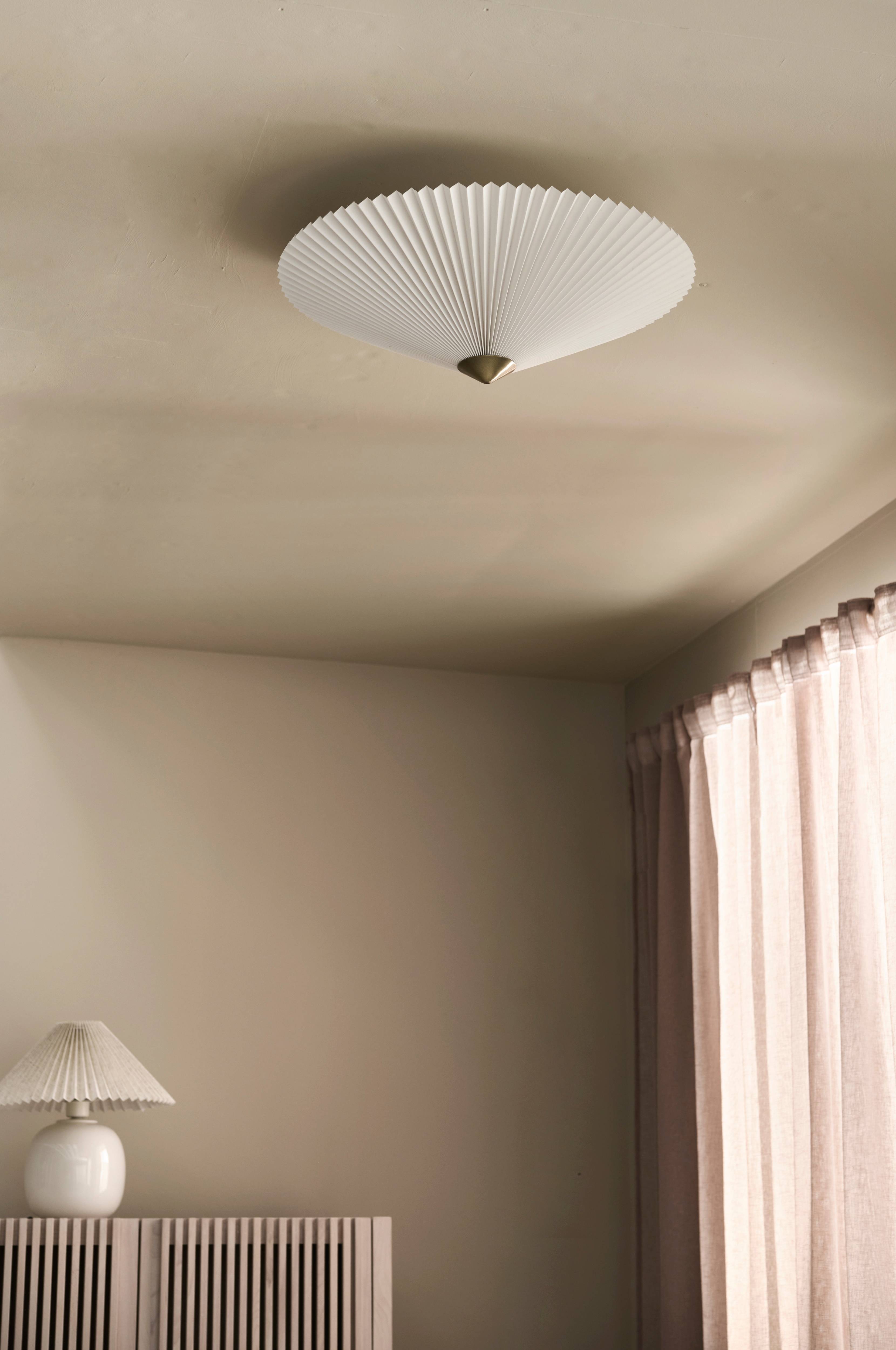 Takplafond med skjerm av plissert tekstil og ekstern detalj av metall i antikkfarget messing. Skjermens mål: Ø 60 cm, høyde 17 cm. Monteres med krokoppheng. Sokkel 3 x E14. Maks. 5 W. Lyspære er ikke inkludert.