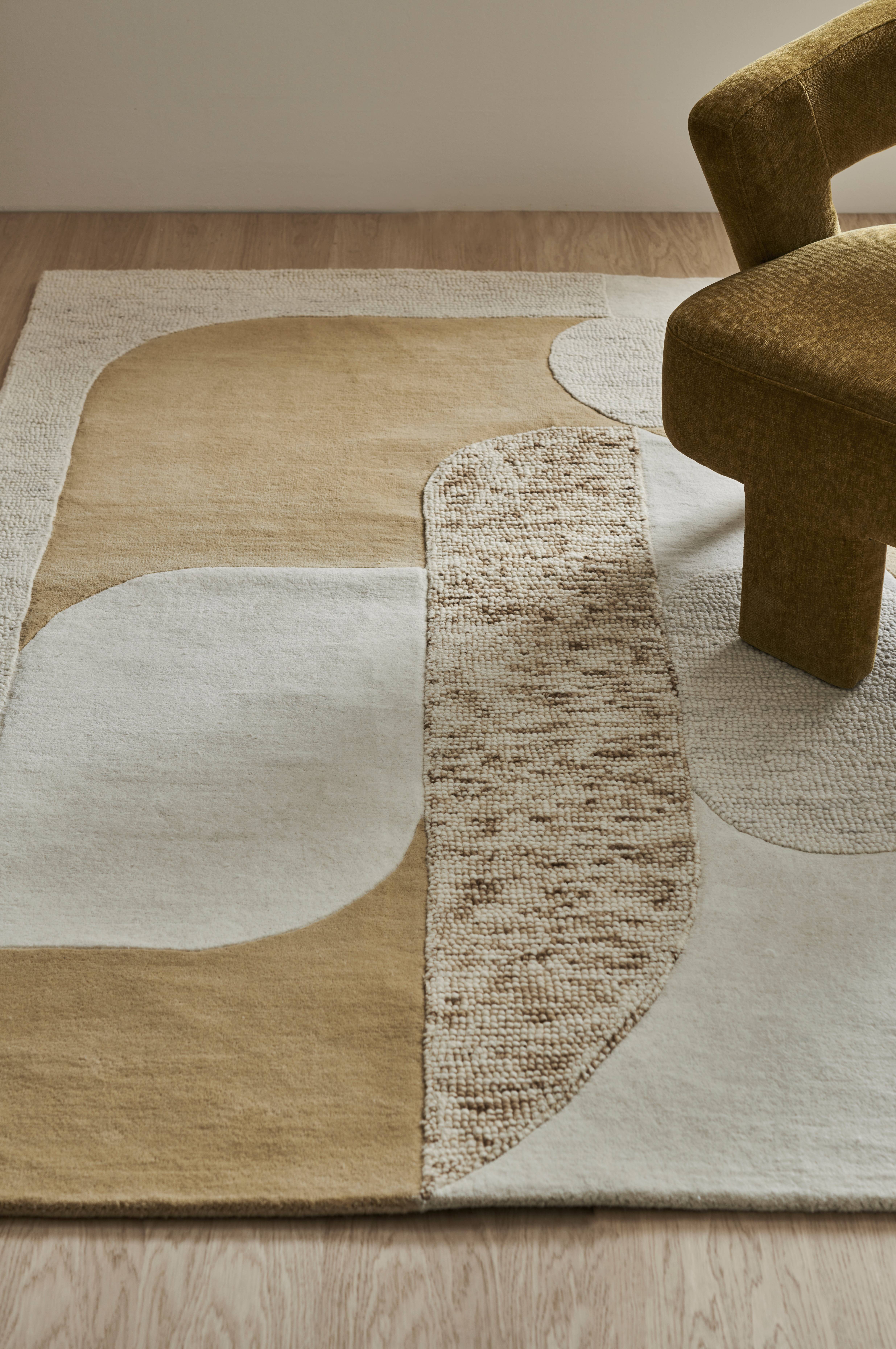Håndvevd og håndtuftet ullteppe med ulike teksturer som skaper patchwork-effekt. Bakside av bomull. Teppets tykkelse 1,5 cm.