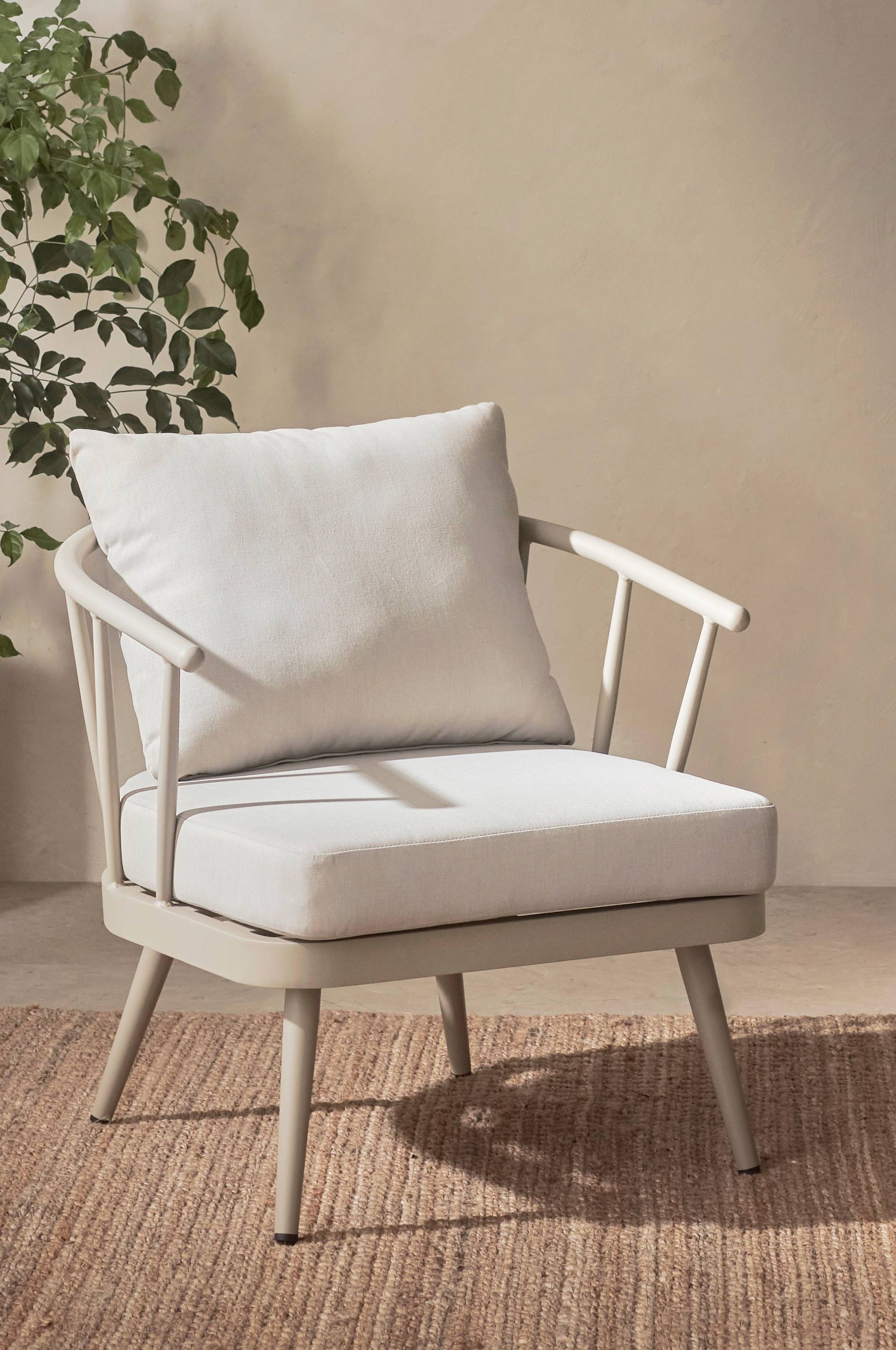 Lenestol med vannbestandig stamme i pulverlakkert aluminium. Sittepute og ryggpute med trekk av polyester og skumfyll.