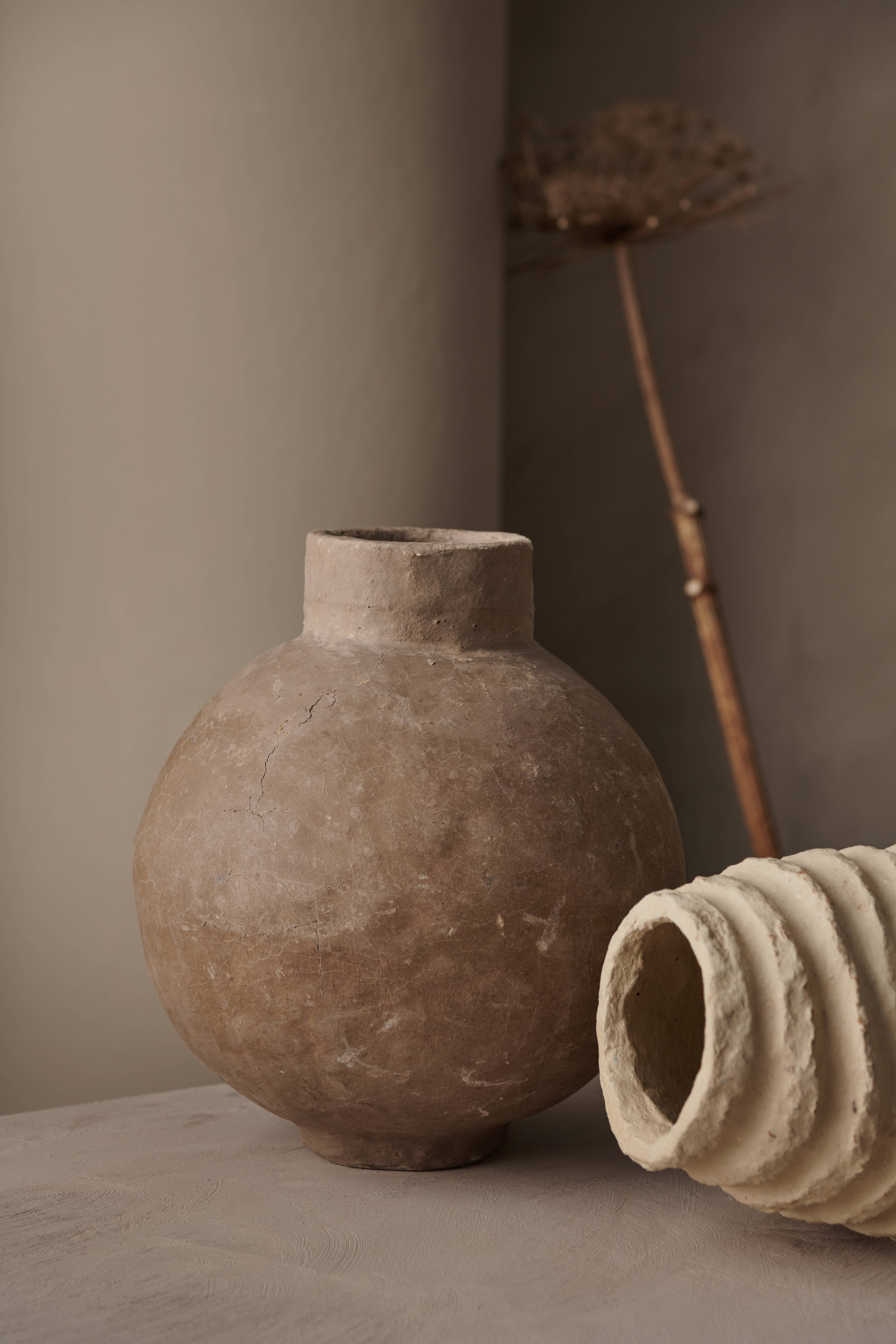 Håndlaget vase av pappmasje i stødig og stabil kvalitet. Diameter på det største ca. 28 cm, diameter innvendig åpning 10 cm. Tåler ikke vann eller ild. Ikke for utendørs bruk. Produsert av gjenvunnet papir. Fordi vasen er håndlaget kan det forekomme variasjoner i form, finish og vekt.