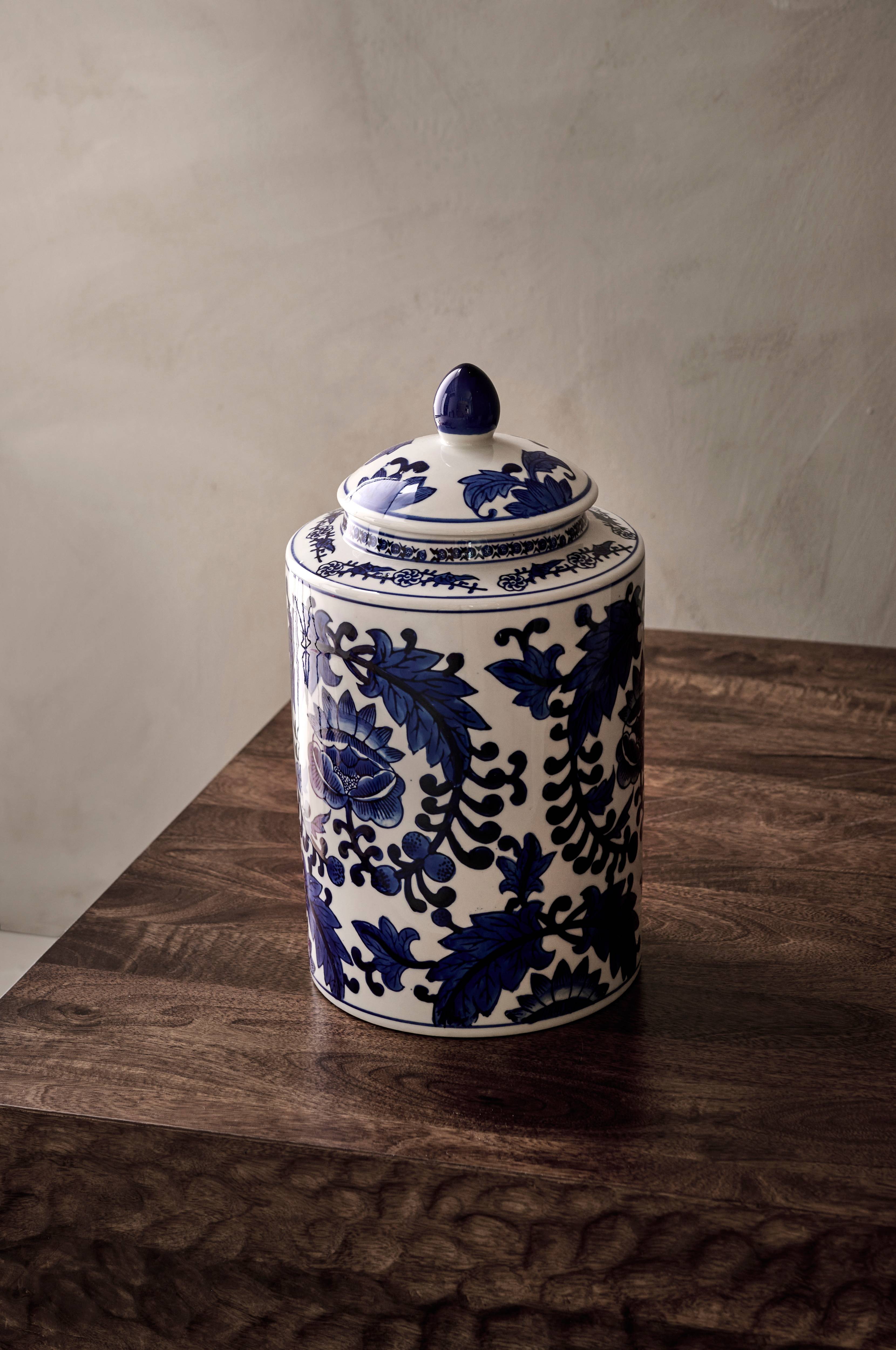 Mønstret vase / krukke med lokk. Av porselen. Høyde med lokk 34 cm, høyde uten lokk 27 cm. Diameter 18 cm. Indre diameter åpning ca. 11 cm. Ikke godkjent til næringsmidler.