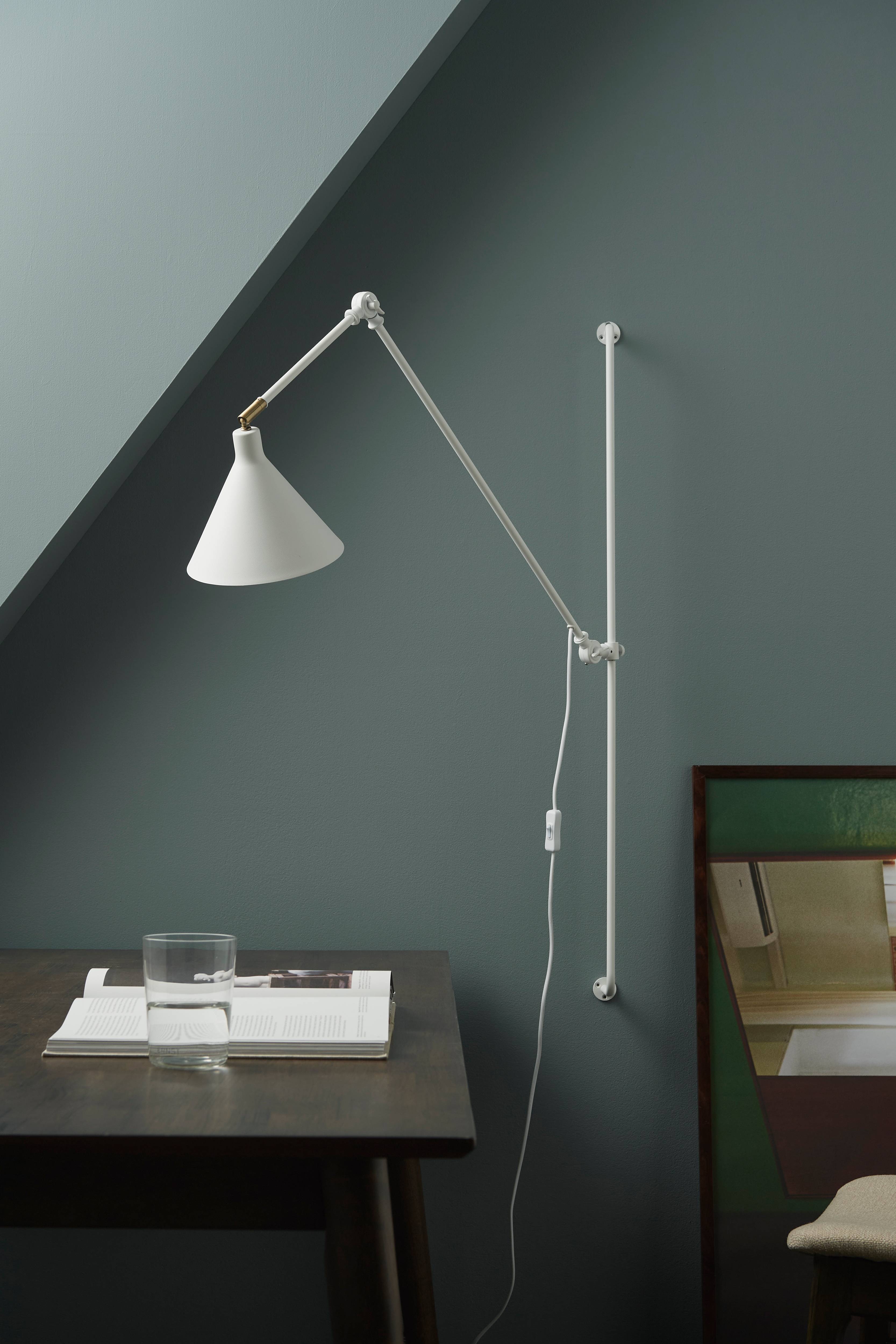 Vegglampe i pulverlakkert metall, montert på et veggfeste med høyde 100 cm. Den lange armen som holder lampeskjermen kan justeres opp og ned. På den lange armen sitter en mindre, justerbar arm som holder lampeskjermen. Skjermen har hvit innside, og er justerbar i høyde- og sideledd. Hele lampen kan justeres på veggfestet i høyde- og sideledd. Lengde på armene 60 resp. 20 cm. Mål på skjerm: høyde 17 cm, Ø 20 cm. Maks totallengde fra vegg 118 cm. Plastledning med strømbryter, ledningslengde 2 m. Stor sokkel E27. Maks 25 W. Lyspære er ikke inkludert.
