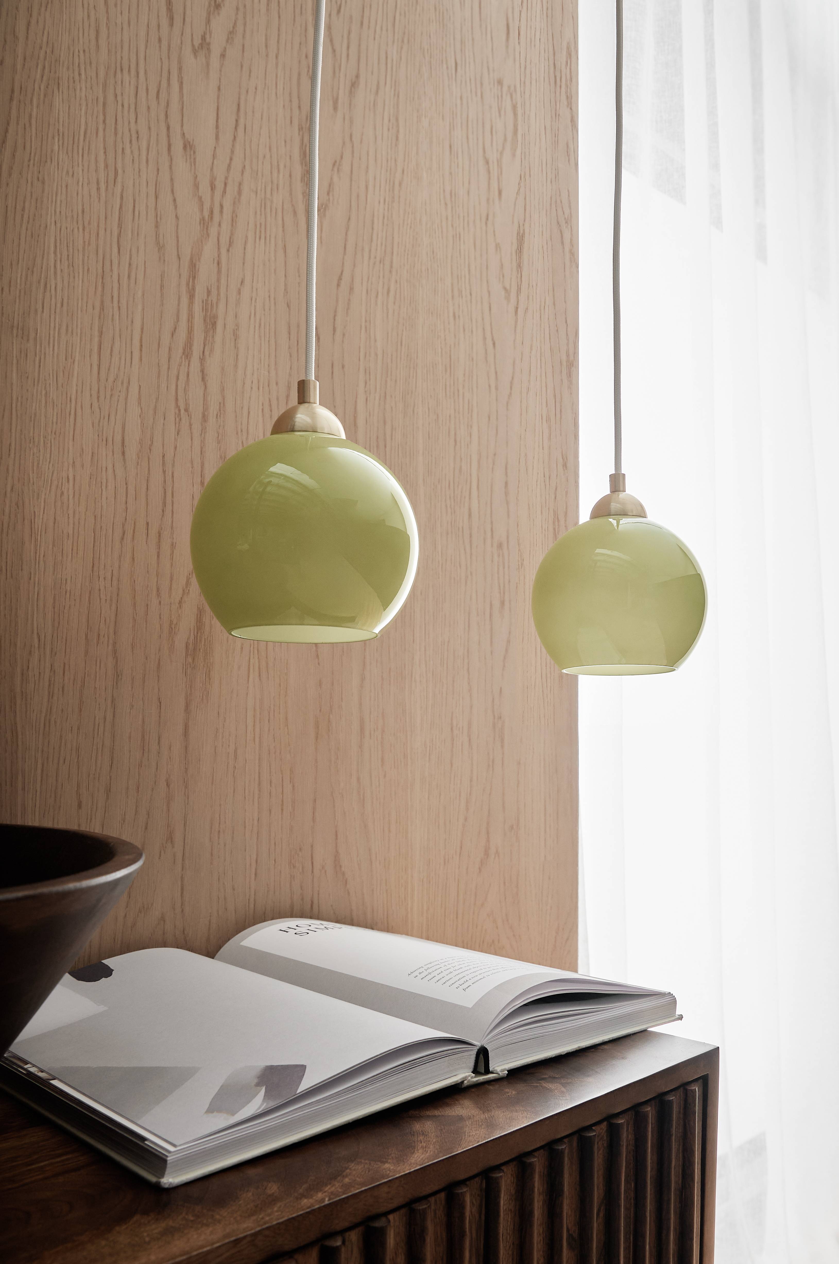 Vinduslampe av malt, blankt glass. Detaljer i metall med børstet messingfinish. Tekstilkledd ledning med strømbryter og støpsel. Lyspære er ikke inkludert.