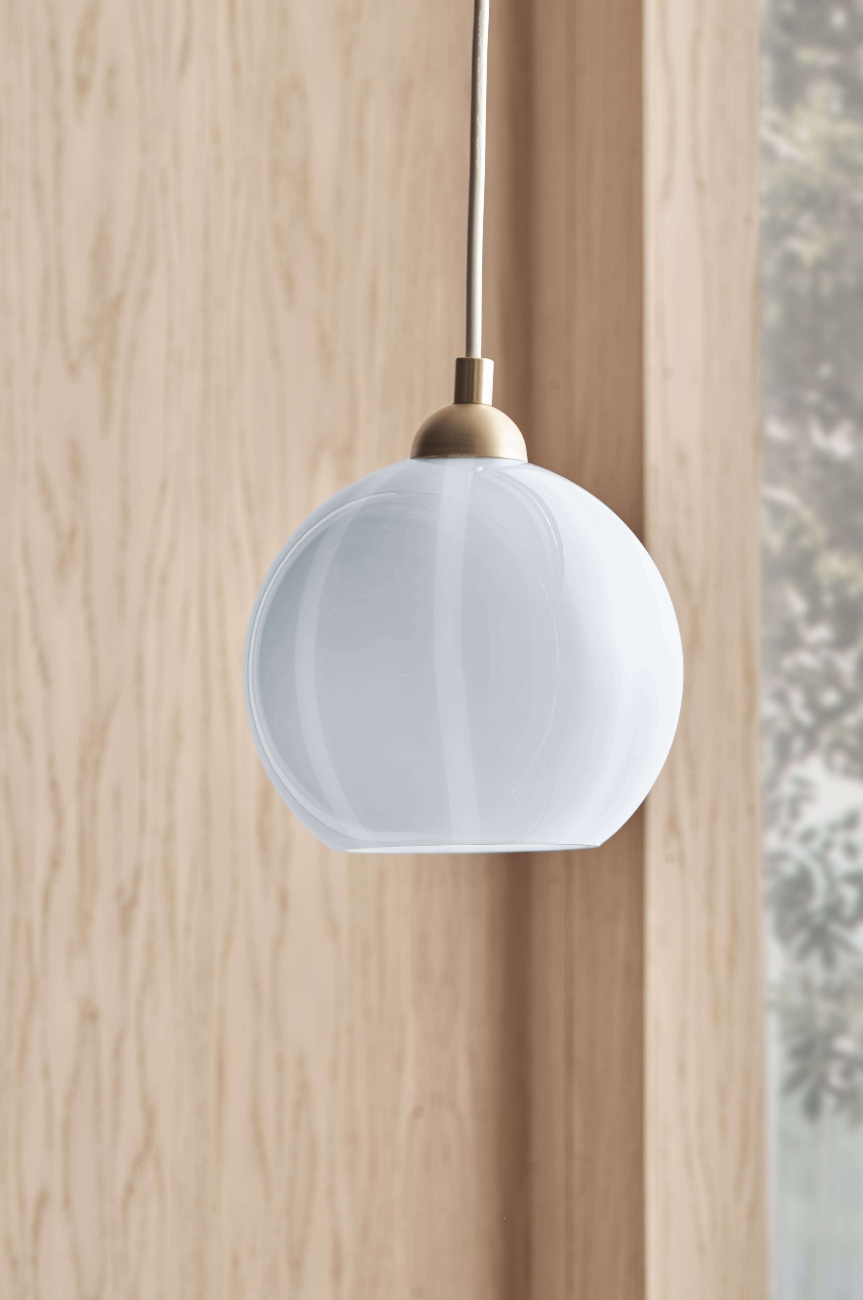 Vinduslampe av glass med stripet mønster. Detaljer og sokkelfeste av metall i antikk messingfinish. Mål på skjermen: Diameter 15 cm, høyde 13,5 cm. Hvit plastledning med støpsel. Lyspære er ikke inkludert.