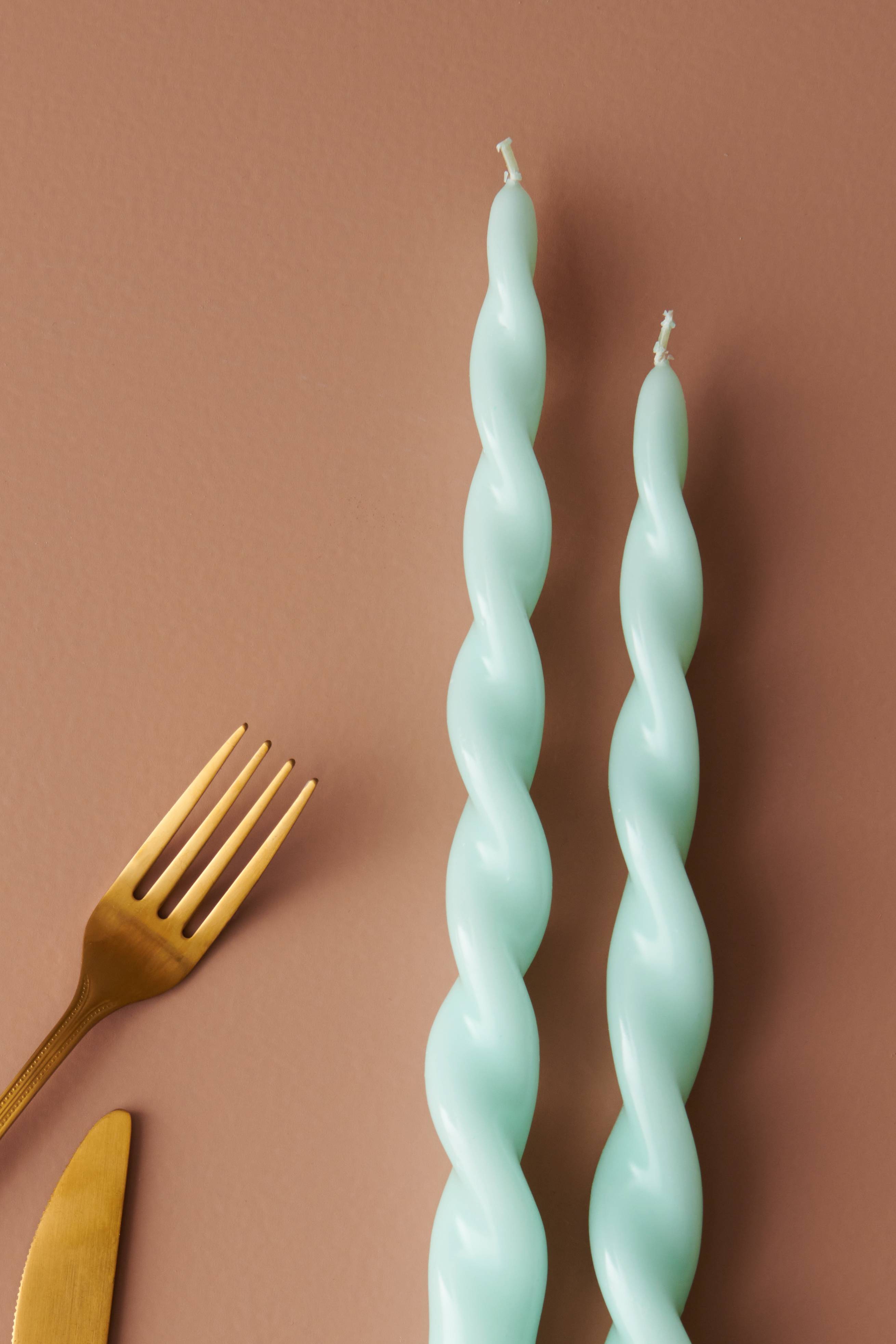 Vridde, flate lys i 2-pk. Høyde 29 cm, diameter 2,2 cm. Brennetid ca. 9 timer. Lysene er fremstilt av 100% parafin. Parafin er brukt istedenfor stearin fordi dette materialet er mykere. Det gjør at lyset kan vris i fasong. Det er ikke mulig med stearin som er for hardt til å kunne vris.