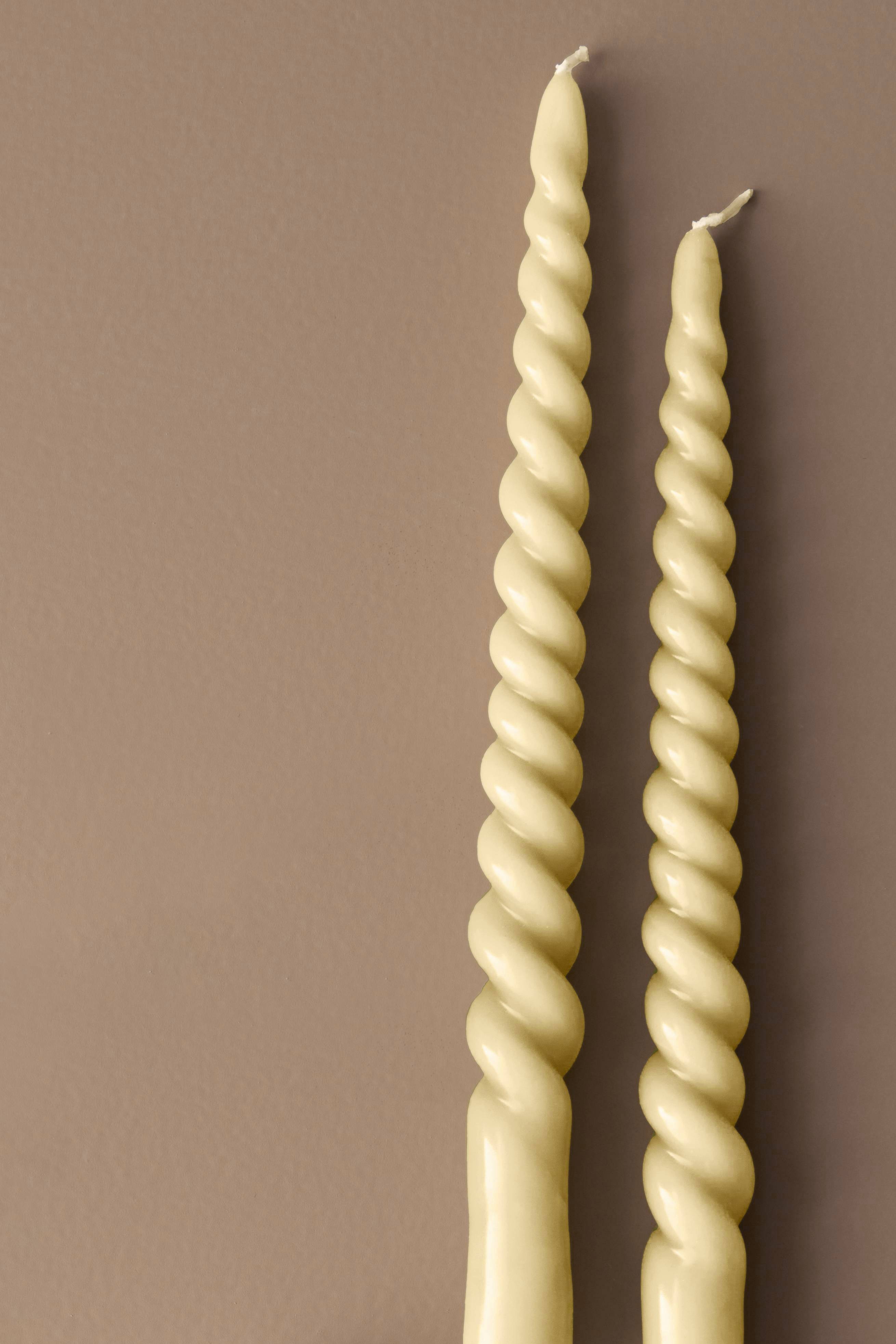 Vridde lys i 2-pk. Høyde 29 cm, diameter 2,2 cm. Brennetid ca. 9 timer. Lysene er fremstilt av 100% parafin. Parafin er brukt istedenfor stearin fordi dette materialet er mykere. Det gjør at lyset kan vris i fasong. Det er ikke mulig med stearin som er for hardt til å kunne vris. Viktig! Forlat aldri brennende lys uten oppsikt.