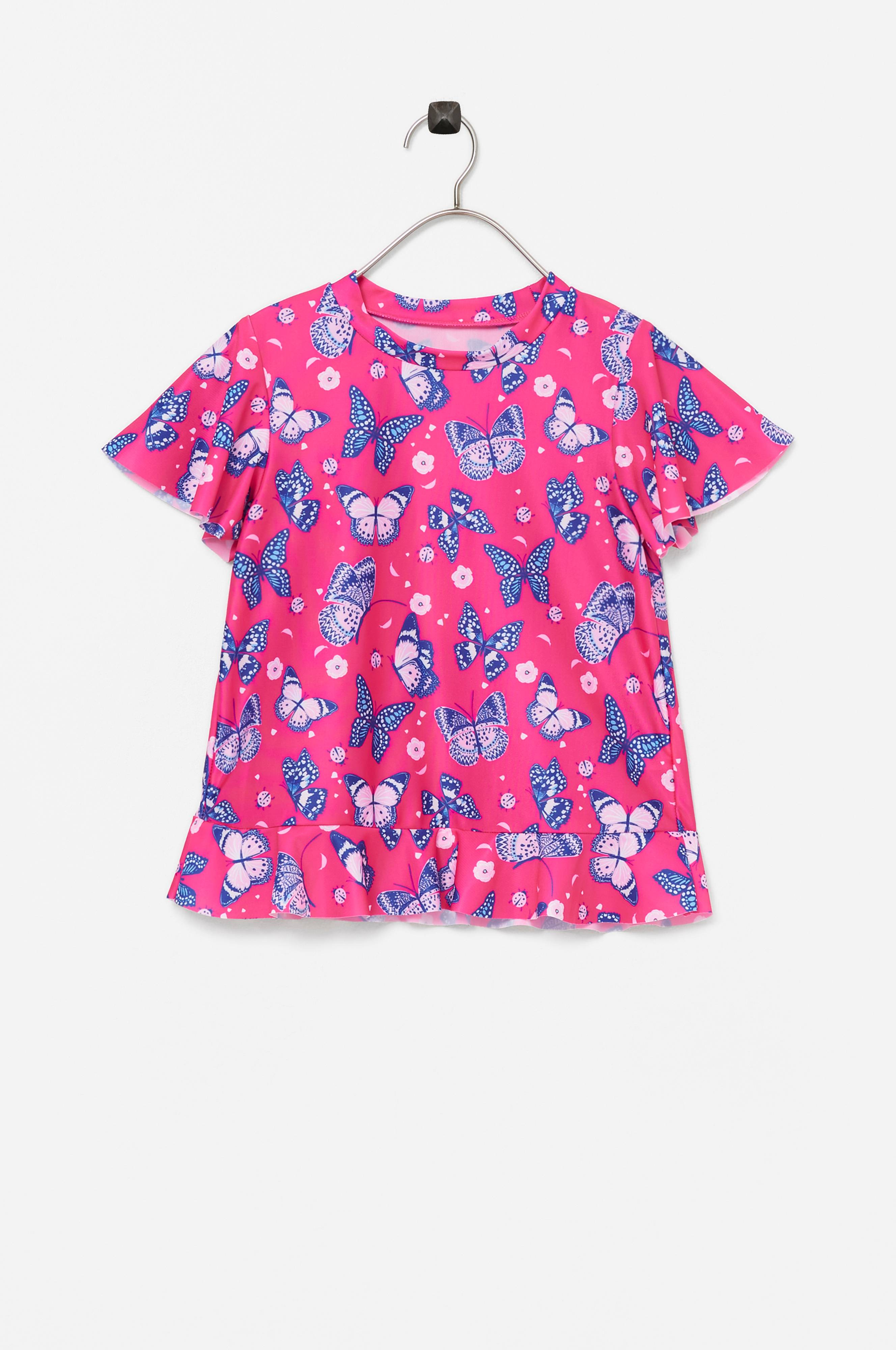 Rett modell med korte, klokkeformede ermer og liten påsydd volang i nederkanten. Rund hals med påsydd kant. Beskytter mot solens farlige stråler med UV-faktor UPF 50+.