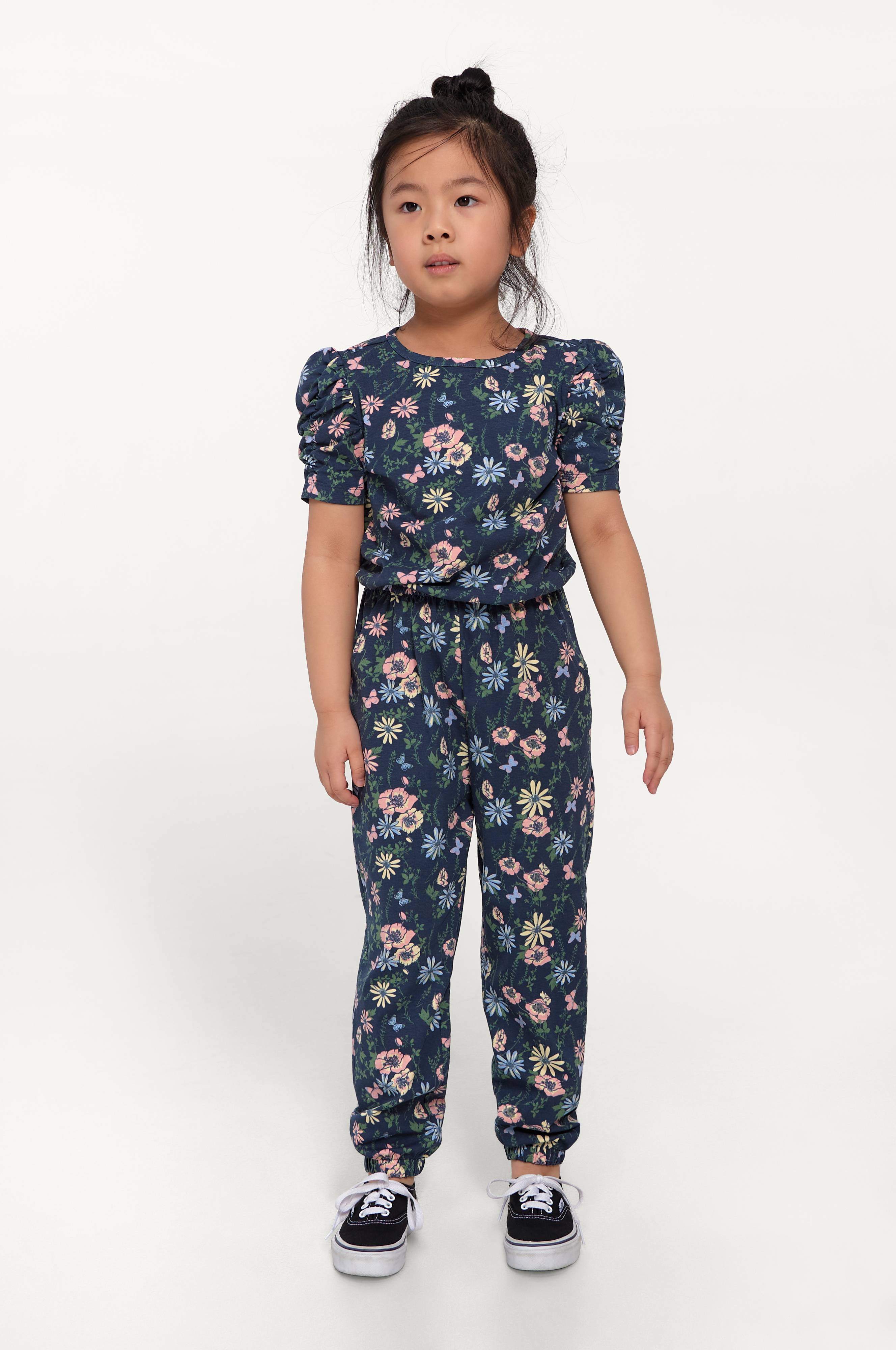 Blomstrete jumpsuit i deilig bomullstrikot. Korte puffermer, elastisk midje og strikk i benkantene. Trykknapper i nakken og lomme i sidene.