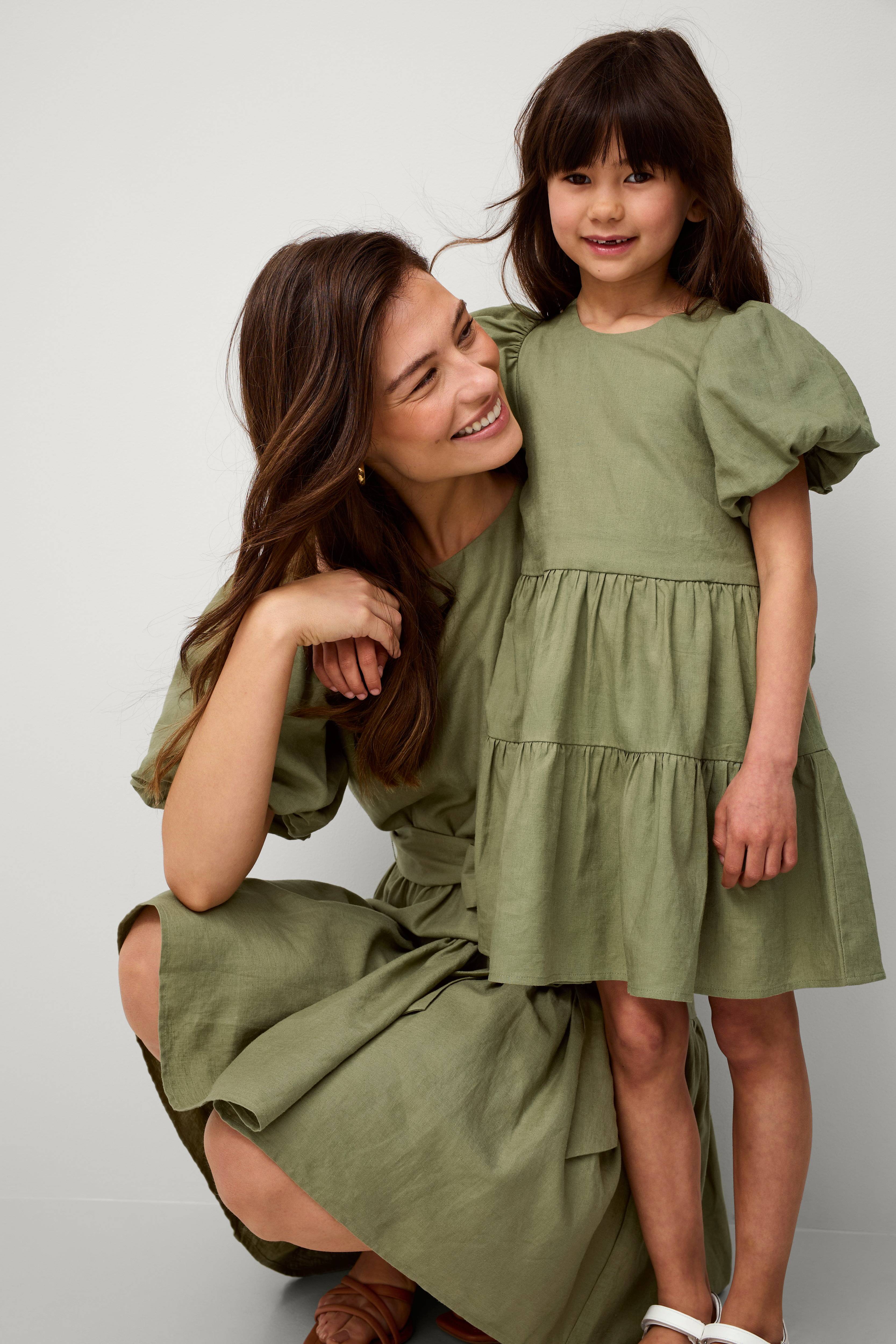 • Kjole i linmiks• Rund halsringning• Glidelås oppover ryggen• Korte ballongermer med gummistrikk i ermeslutten• Utskjæringer på skjørtet med rysje rundt