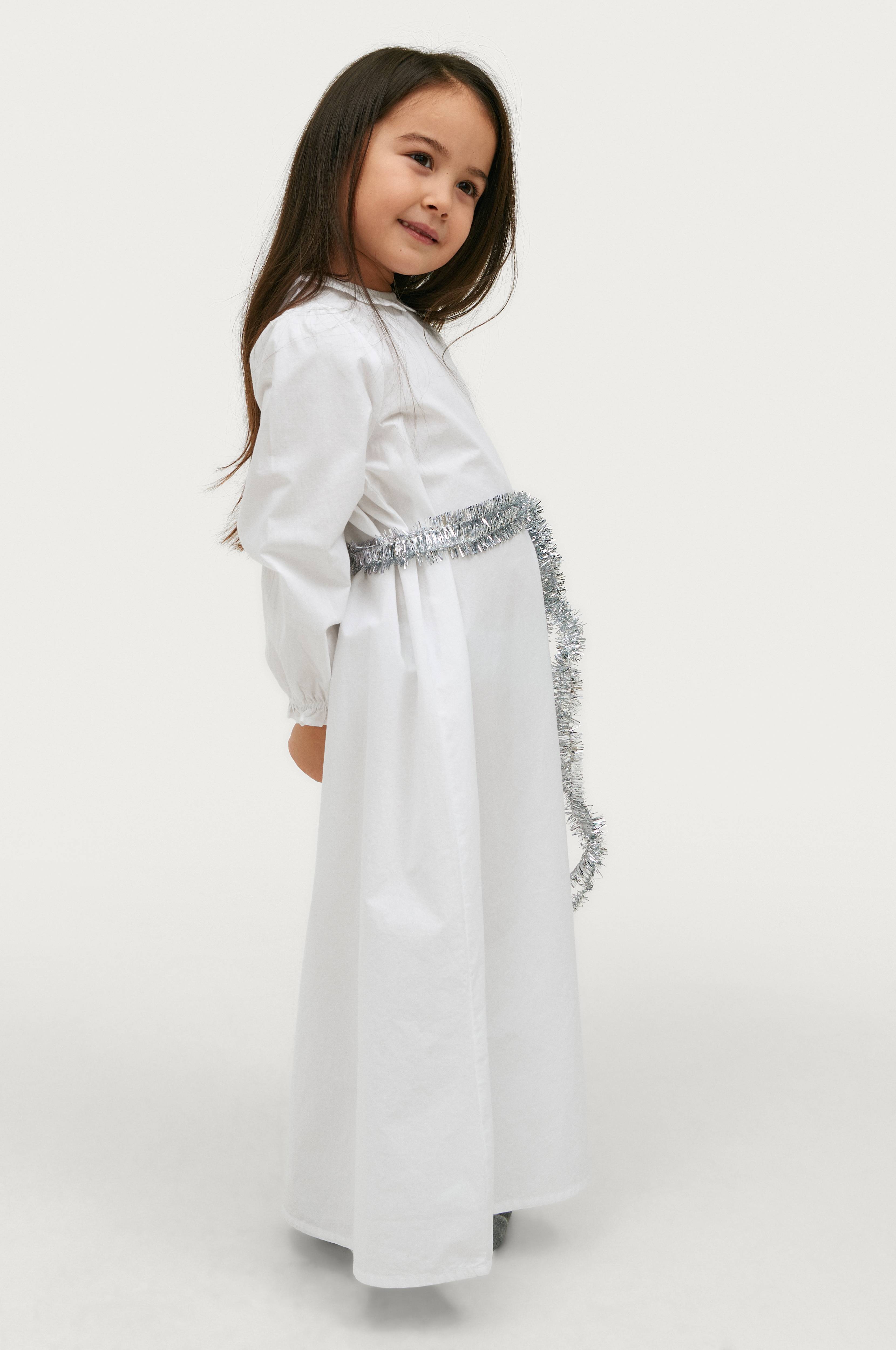 Luciadrakt med liten krage og splitt med knapp i nakken. Lange ermer med strikk og liten volang i ermekantene.