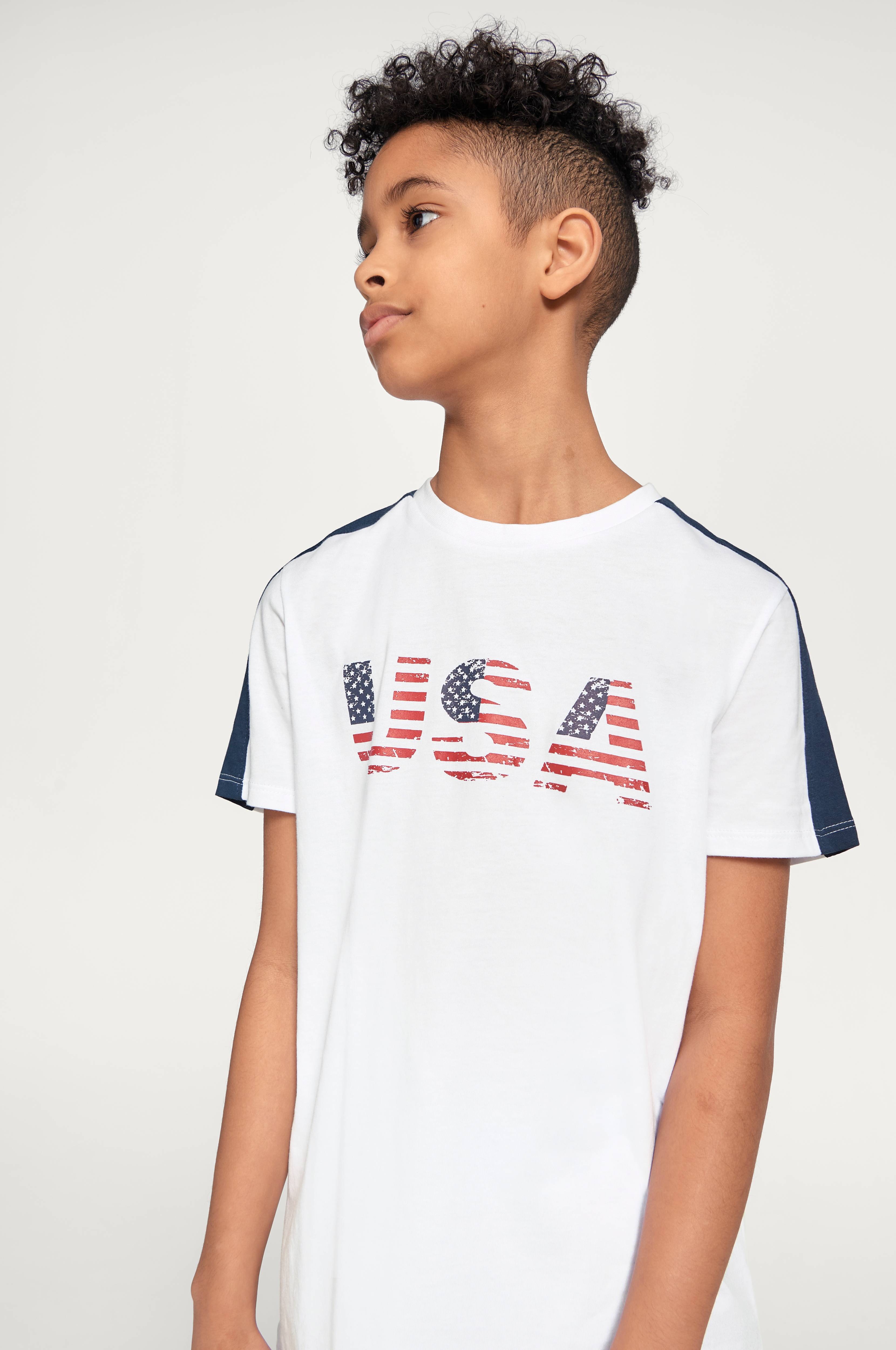 Kortermet T-shirt i bomullstrikot med trykk foran og kontrastfarget panel på ermene.