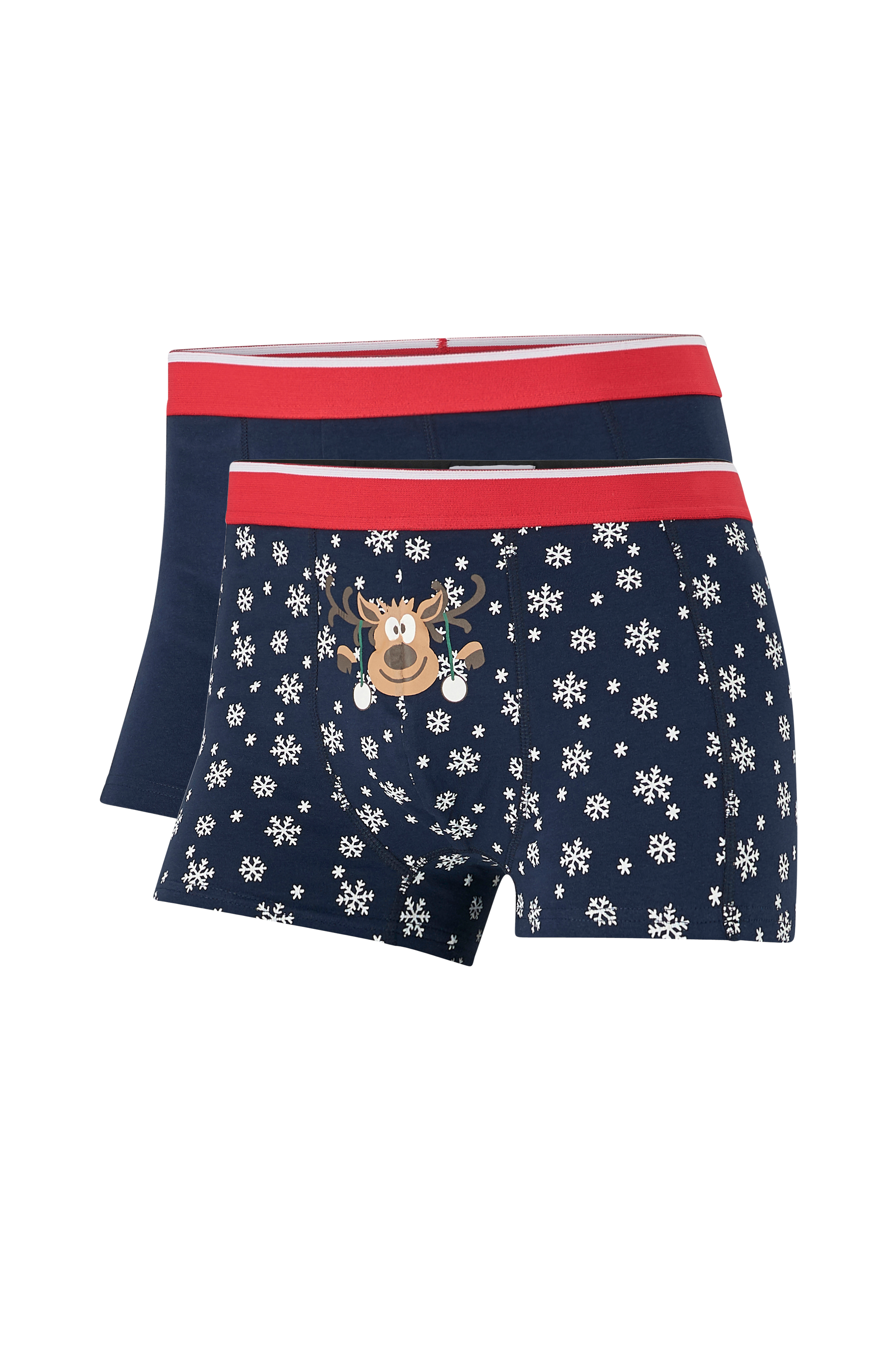 2 juletruser i boxermodell, en ensfarget og en mønstret. Av stretchtrikot med påsydd strikklinning og dobbel front.