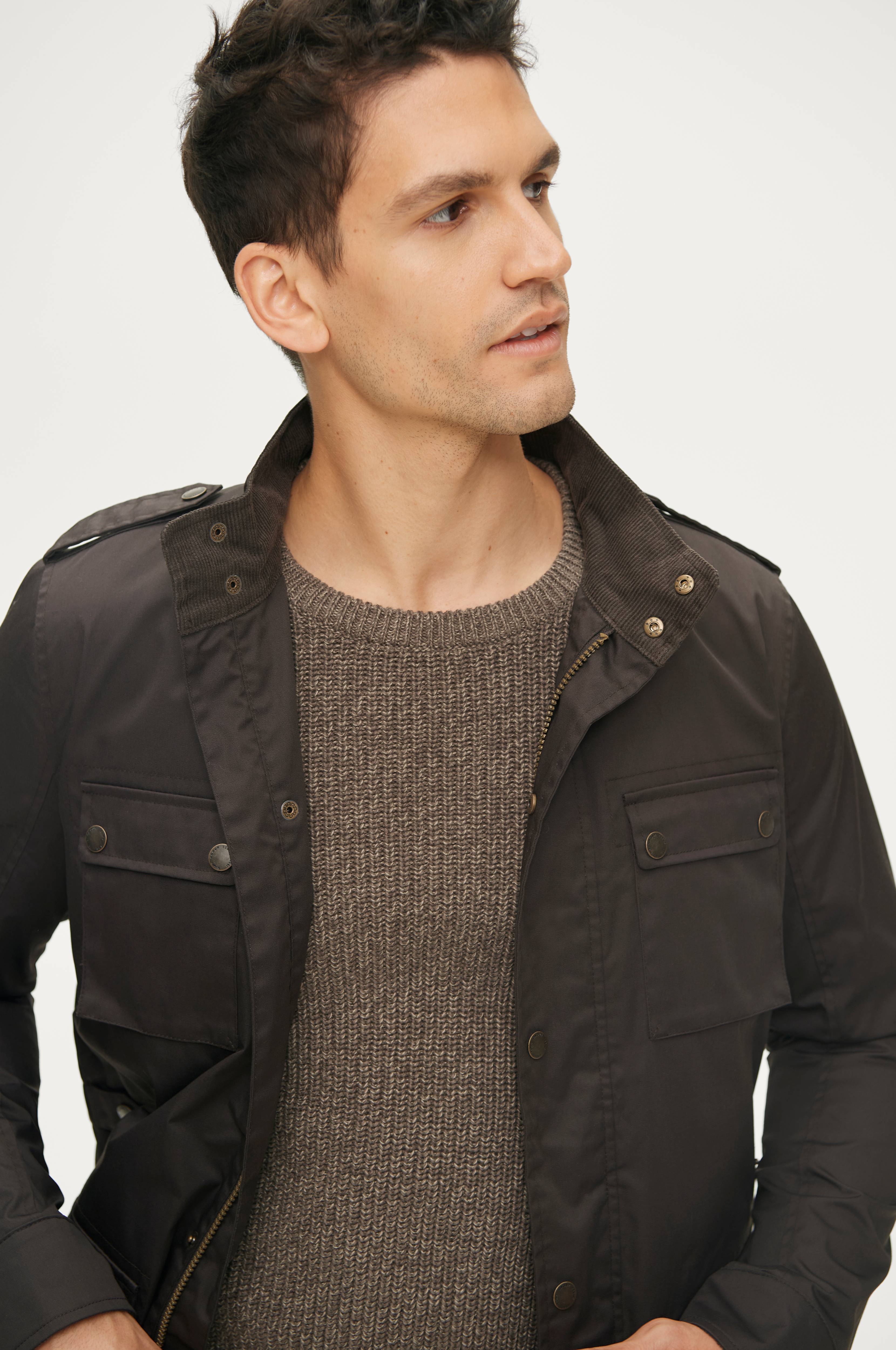 Jakke Maxwell fra On Our Terms med vevd ytterstoff og rutete, vevd fôr. Høy, rund krage med kordfløyel på innsiden. Skulderklaffer. Lukkes med glidelås og vindstolpe med trykknapper. Regulerbar vidde i midje og ermekanter med trykknapper. To lommer nederst og to brystlommer, alle med lommeklaff som kan lukkes med trykknapper. To innerlommer med trykknapper. To splitter som kan knappes bak. Lengde ca. 79 cm i str M.