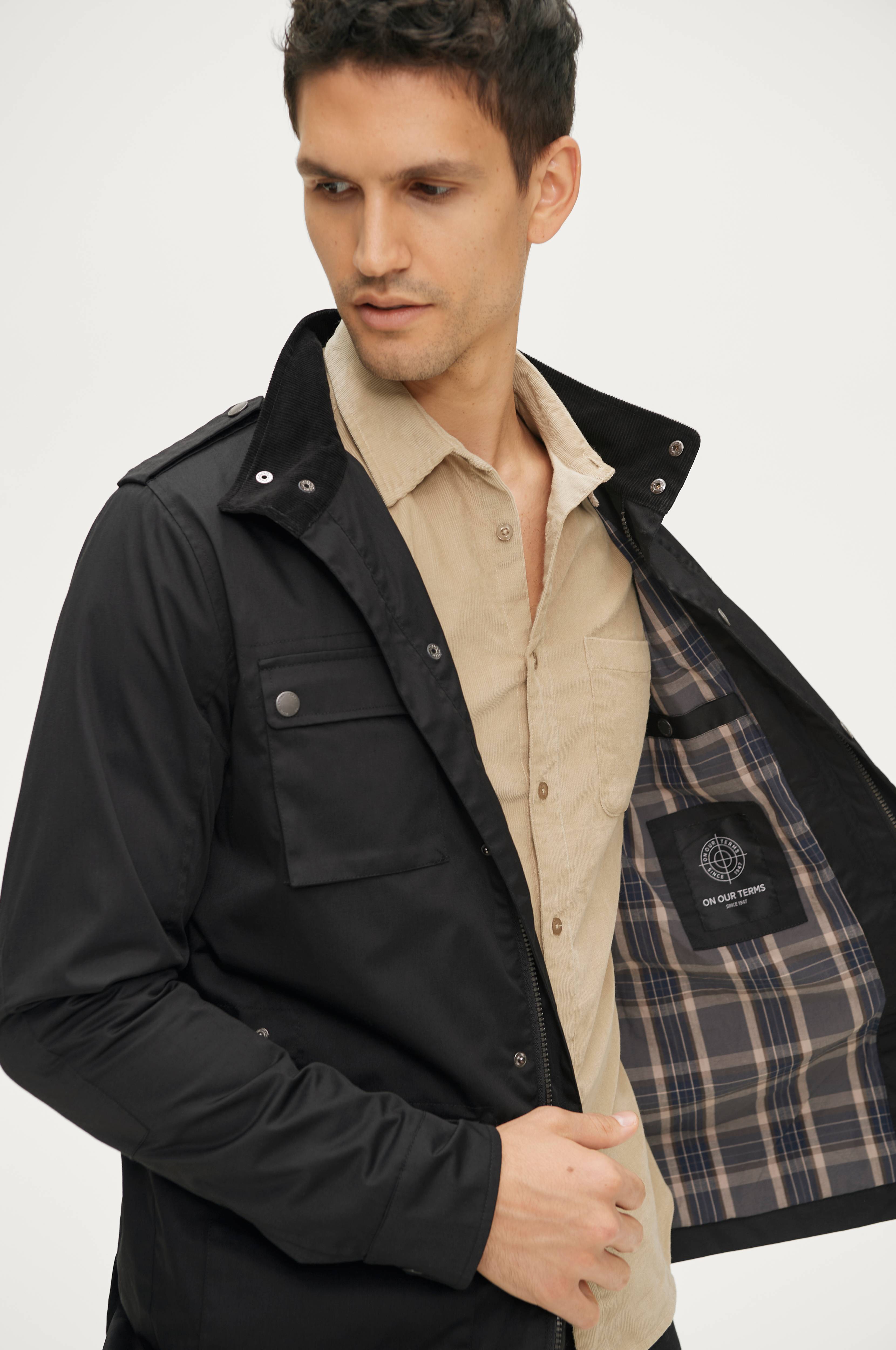 Jakke Maxwell fra On Our Terms med vevd ytterstoff og rutete, vevd fôr. Høy, rund krage med kordfløyel på innsiden. Skulderklaffer. Lukkes med glidelås og vindstolpe med trykknapper. Regulerbar vidde i midje og ermekanter med trykknapper. To lommer nederst og to brystlommer, alle med lommeklaff som kan lukkes med trykknapper. To innerlommer med trykknapper. To splitter som kan knappes bak. Lengde ca. 79 cm i str M.