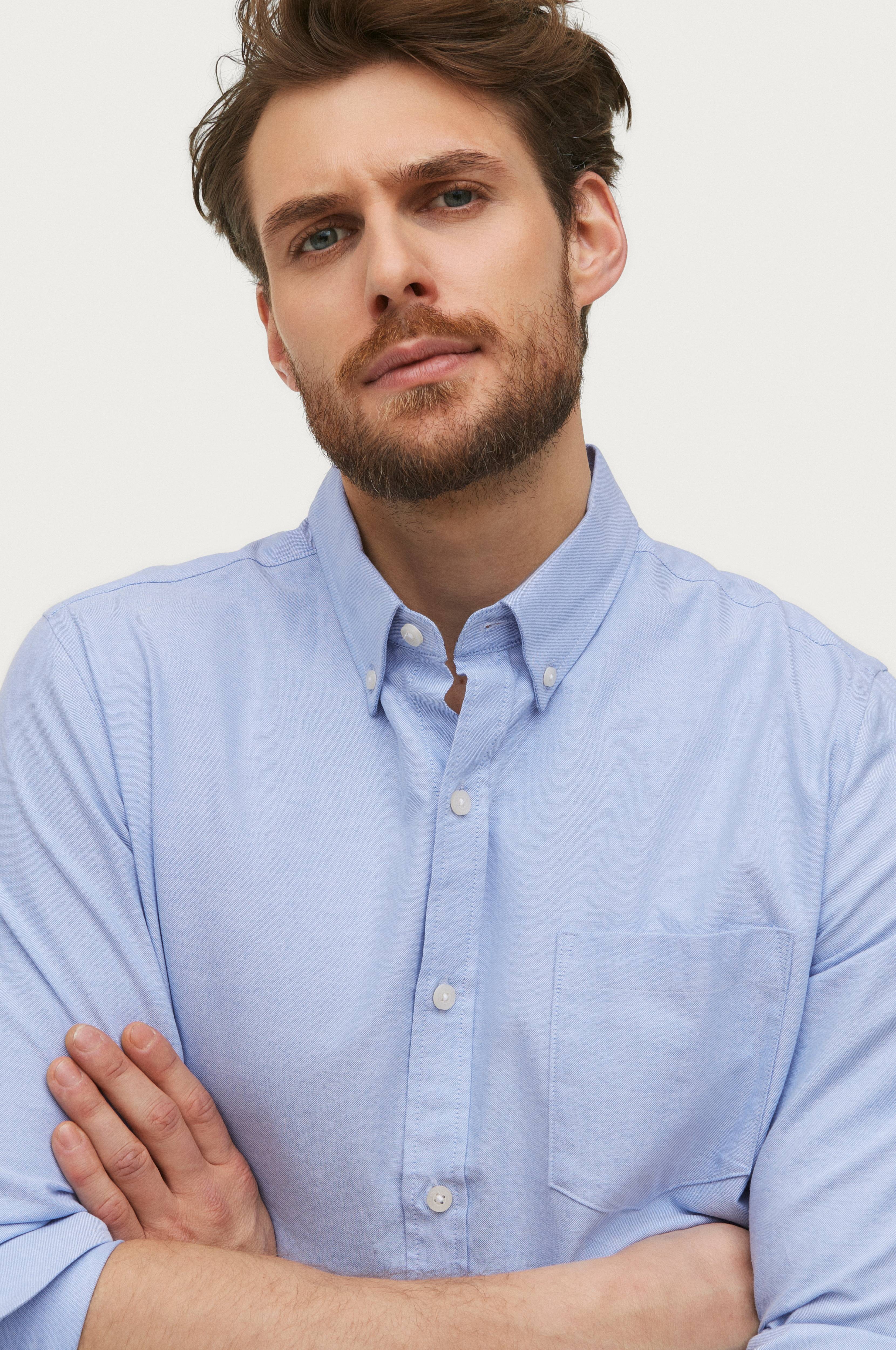 Oxfordskjorte Jake fra On Our Terms med button down-krage og brystlomme. Lange ermer med mansjett og knapper. Avrundet nederkant som er noe lenger bak. Lengde foran ca. 72 cm i str M.