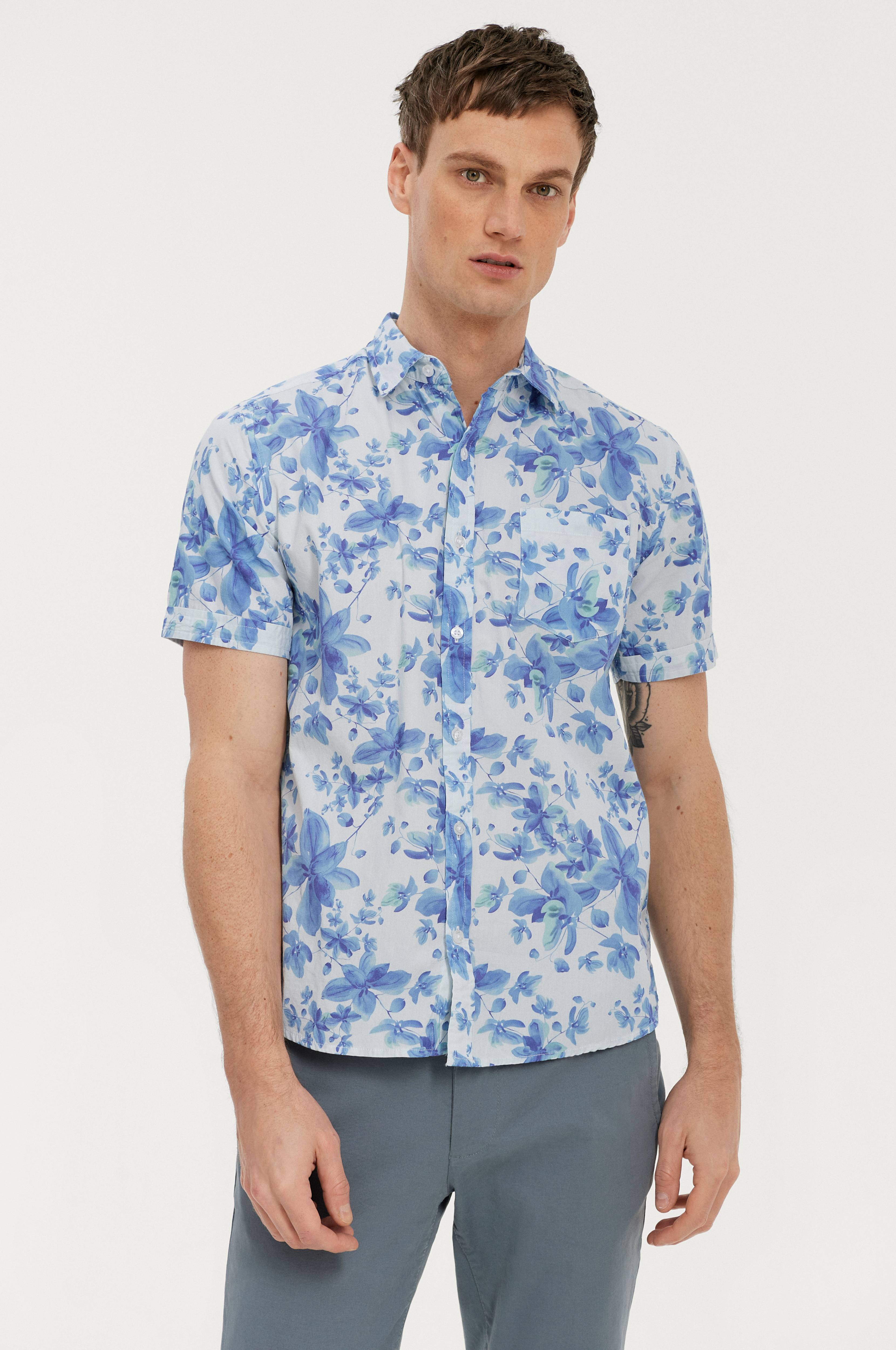 Kortermet skjorte i bomull med trykt mønster. En brystlomme. Avrundet nederkant.