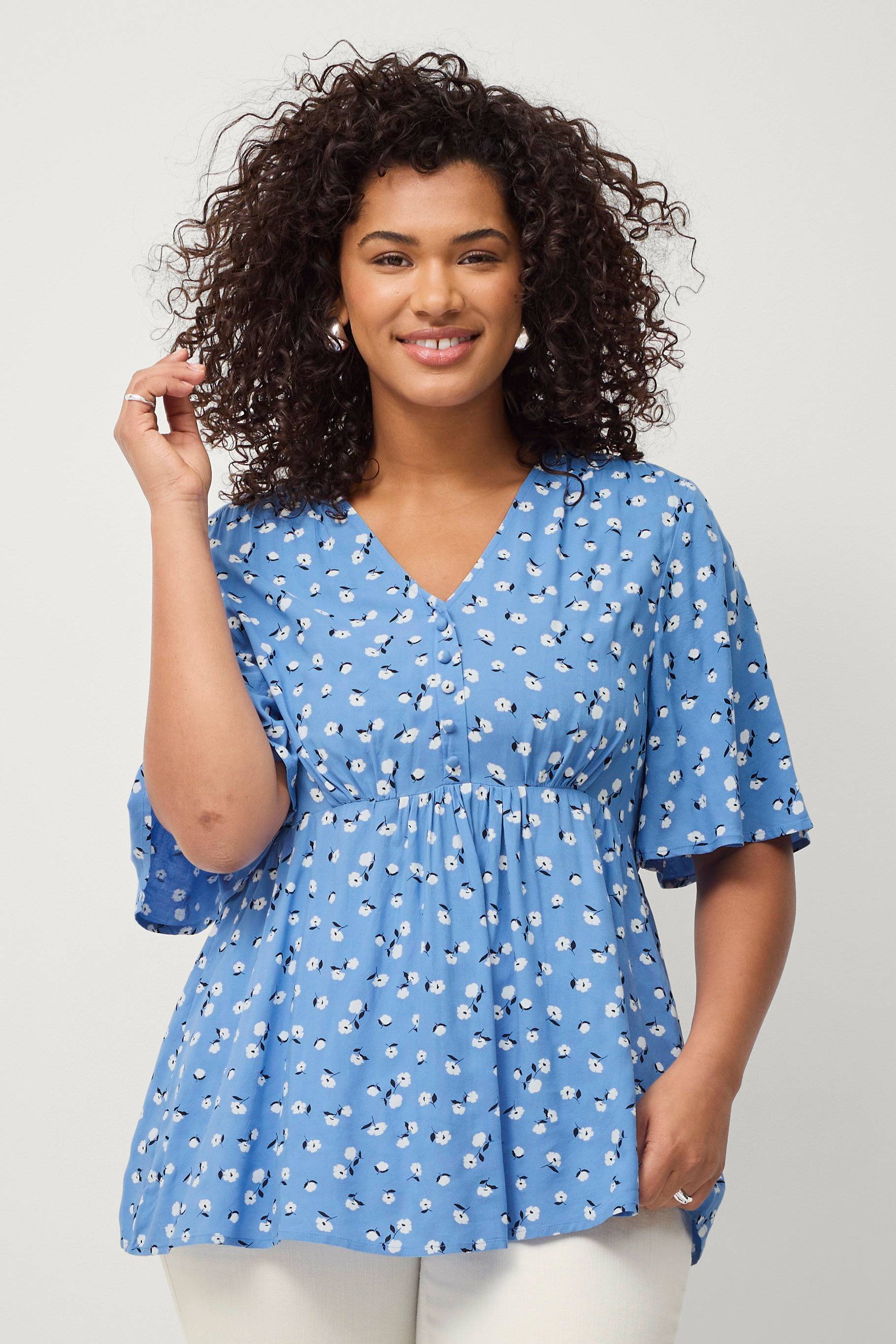 • Mønstret bluse i viskose• V-hals med kledde knapper• Korte, brede ermer• Rysje nedenfor bysten og på skuldrene• Lengde: 74 cm i størrelse 46/48
