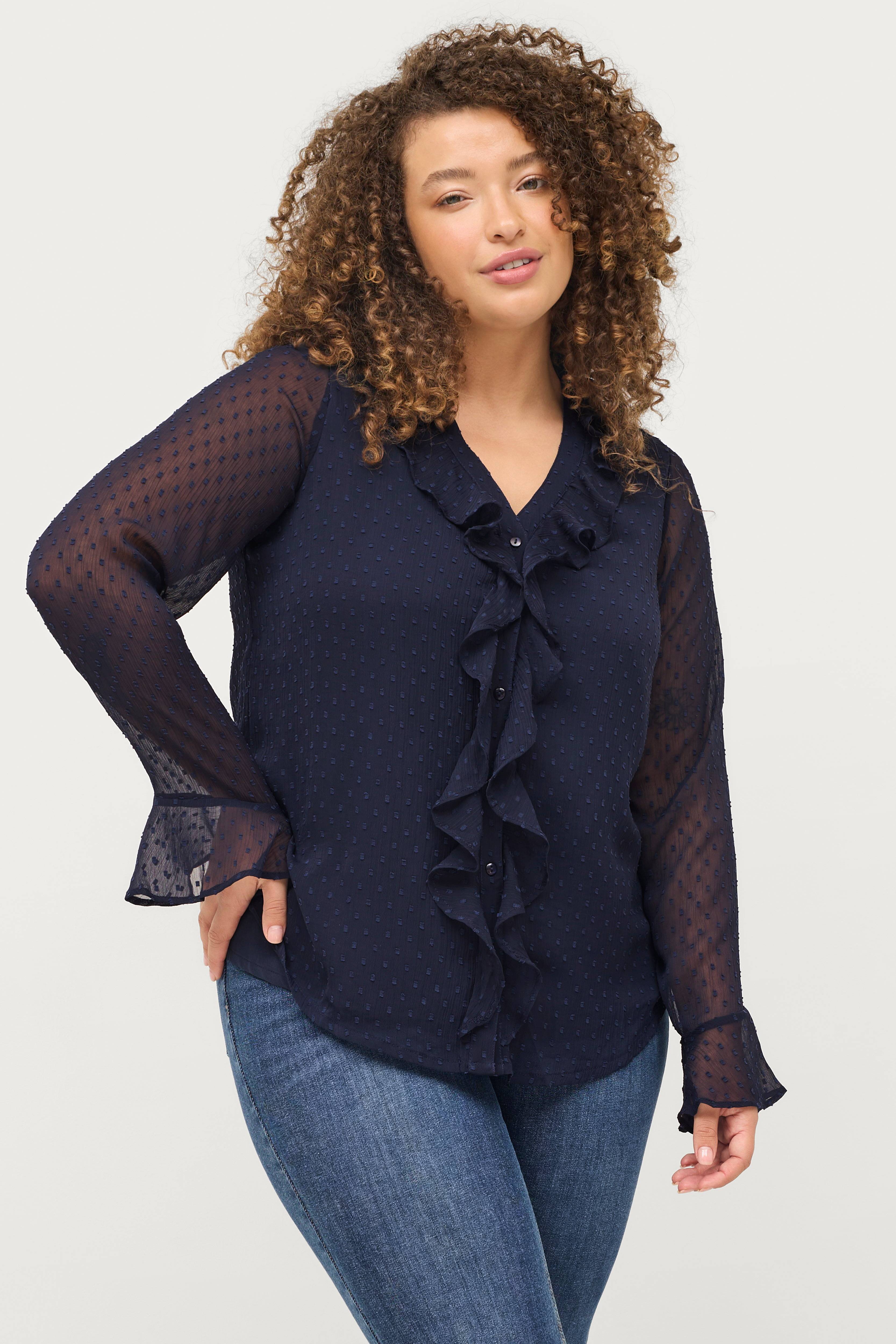• Bluse i chiffon med strukturmønster • Knapper foran • V-hals snitt med volang • Gjennomsiktige armer med volang i ermeslutten • Vevd foring • Lengde: 68 cm i størrelse 42/44